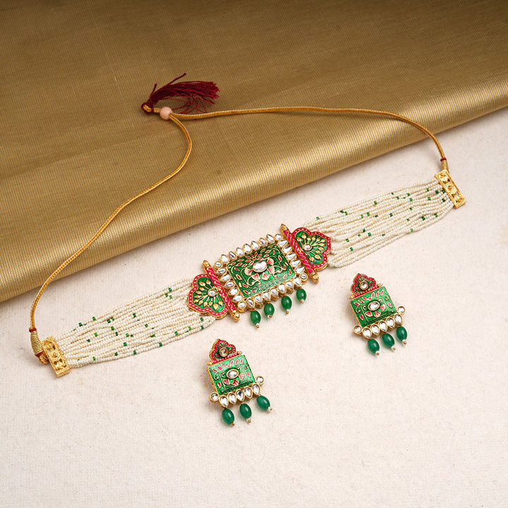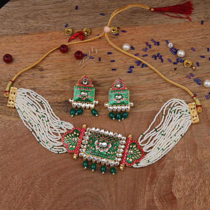 Elevate your ensemble with the Ishani Stone Studded Hanging Pearl Beaded Neckpiece Set in Green. Expertly crafted, this exquisite set features intricate stone detailing paired with delicately hanging pearls, creating a harmonious blend of elegance and sophistication. Ideal for festive occasions or formal events, it adds a refined touch to traditional and contemporary outfits alike. The green accents enrich the overall design, making it a statement accessory that complements a range of color palettes.