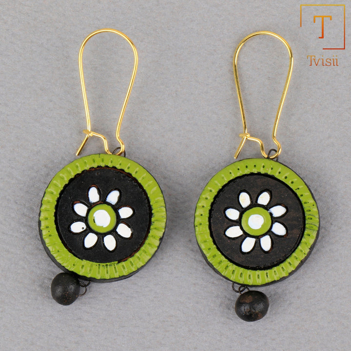 These green and black������ ���ï¿Â"1">������earrings are made up of brownish red coloured and unglazed clay . They have been beautifully crafted by the very talented karigars of Madhya Pradesh using #deshkimitti. They're pure markers of #madeinIndia . #BeVocalForLocal and buy from our beautiful Argil Collection