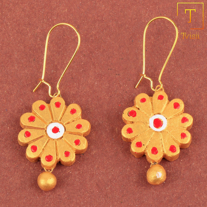 These������ golden gorgeous looking earthen������earrings are made up of brownish red coloured and unglazed clay . They have been beautifully crafted by the very talented karigars of Madhya Pradesh using #deshkimitti. They're pure markers of #madeinIndia . #BeVocalForLocal and buy from our beautiful Argil Collection
