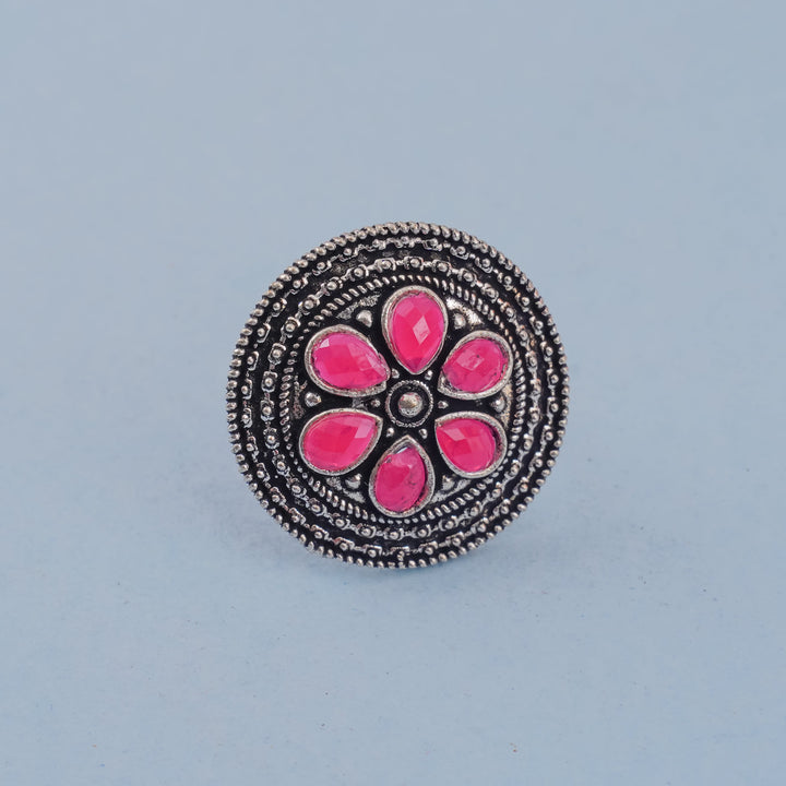 Vibrant and bold, this red stone studded brass adjustable ring adds a touch of drama. Its striking design makes it a perfect statement piece. The adjustable band ensures a comfortable fit, making it ideal for special occasions.