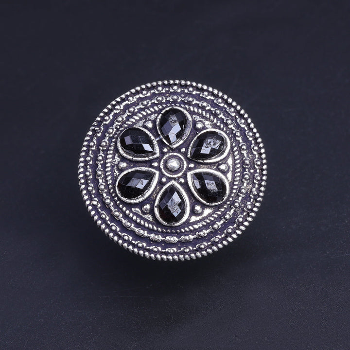 Elegant and timeless, this black stone studded brass adjustable ring complements any outfit. Its classic design makes it a must-have accessory. The adjustable band ensures a perfect fit, adding a touch of sophistication to your look.