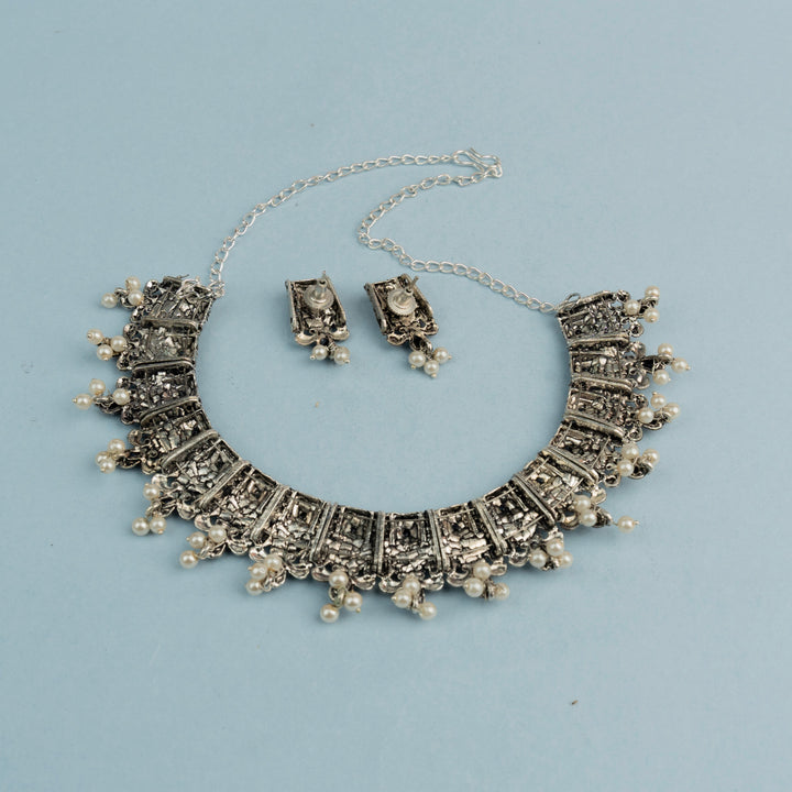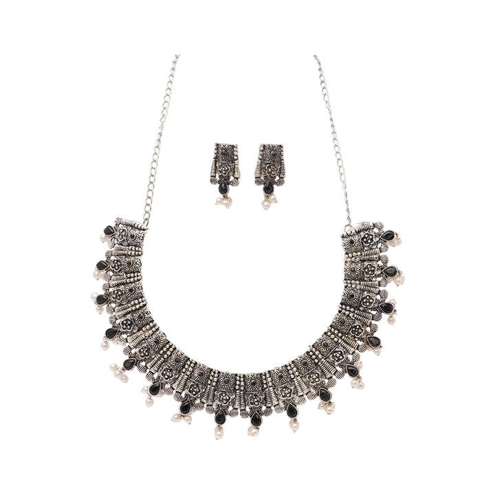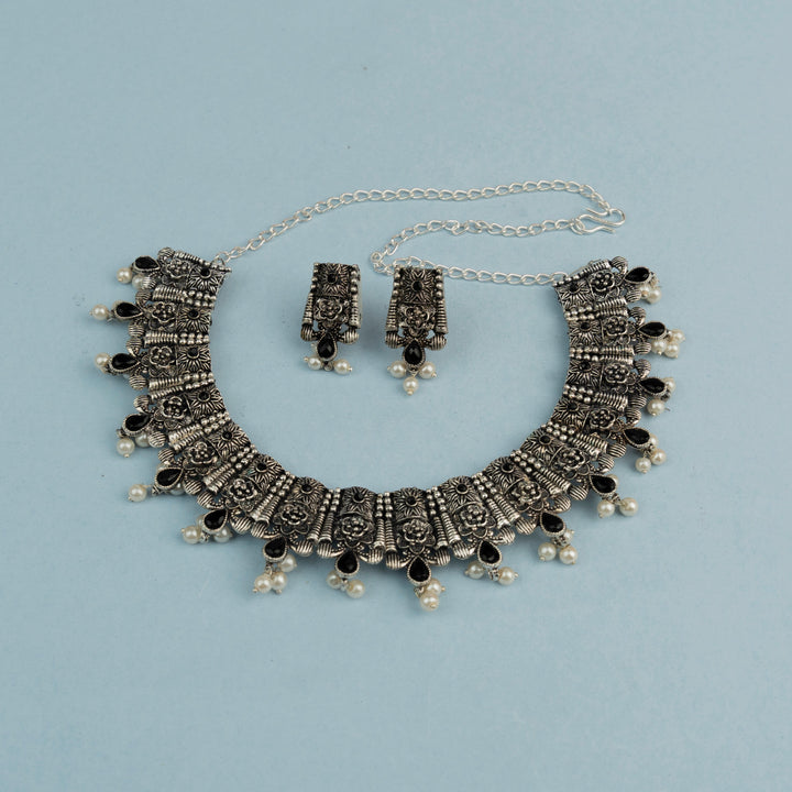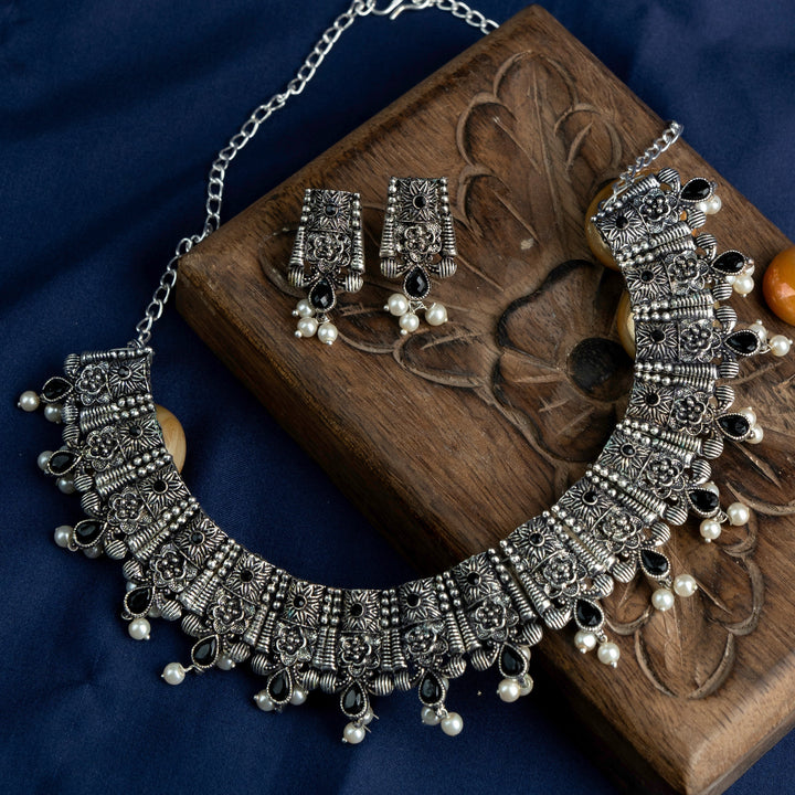 Make a statement with our black stone studded German silver neckpiece set. Bold and sophisticated, it's ideal for formal occasions and evening events.