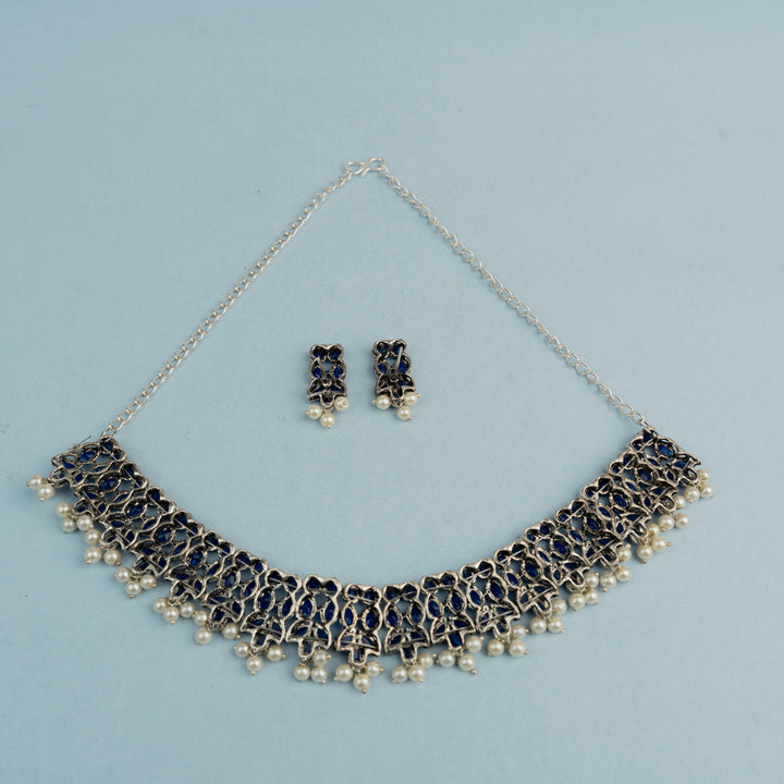 Embrace serenity with our blue stone studded German silver neckpiece set. Featuring calming blue stones and intricate design, it offers timeless elegance.