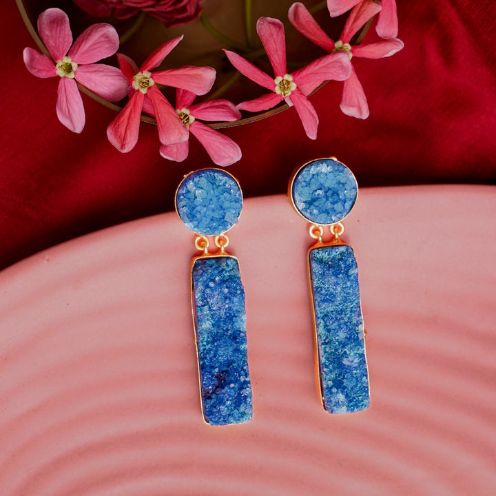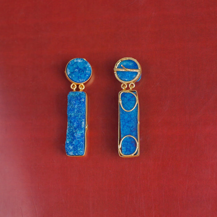 These Blue Unpolished Stone Earrings feature a unique, natural design. Each earring is unique, making them a perfect addition to any jewelry collection. The stone is unpolished for a rustic, natural look.