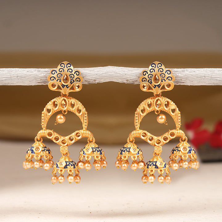 These Hamsika earrings feature exquisite blue stones delicately studded to enhance their elegant design. The hanging pearl danglers add a graceful movement, making them a perfect accessory for both formal occasions and sophisticated everyday wear. Crafted to combine timeless charm with contemporary style, they elevate any outfit with subtle shimmer and refined detail.
