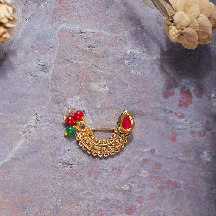 Elevate your traditional elegance with the Shruti Stone Studded Hanging Pearl Nath, featuring vibrant green and red multicolor stones. This exquisite nose ring combines intricate craftsmanship with dangling pearls, adding graceful movement and a refined touch to your ensemble. Perfect for festive occasions, it enhances your look with a subtle yet striking statement of style.