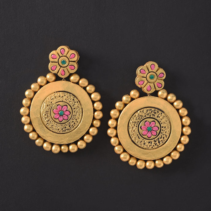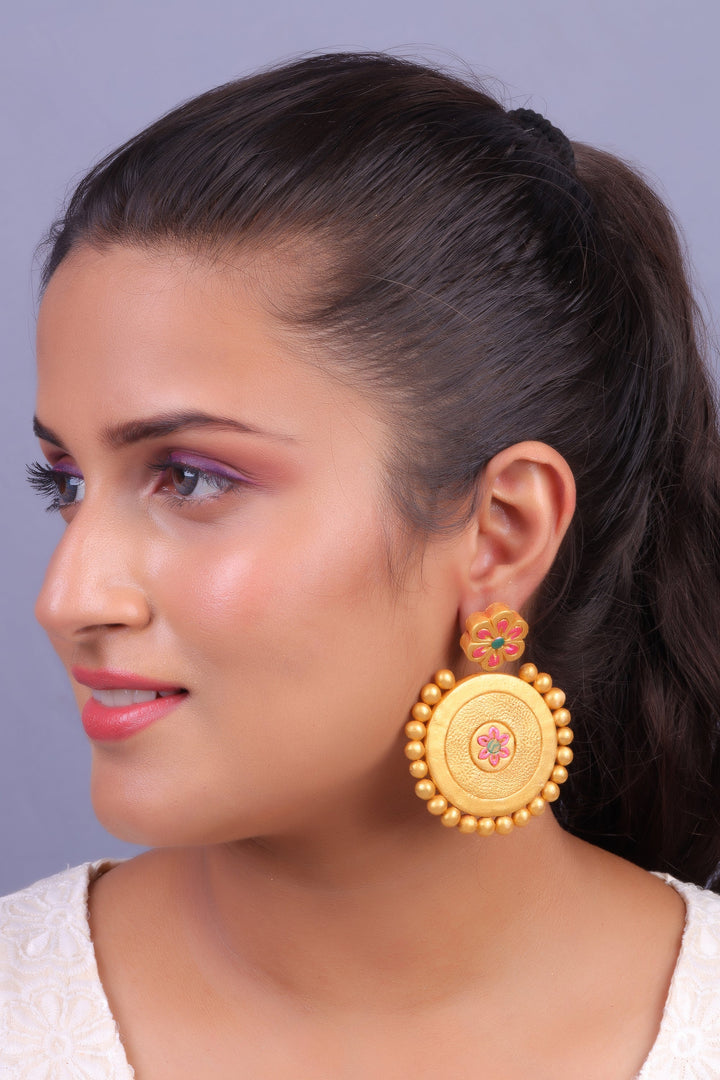 These royal looking golden dangles are made by the very talented artists of Madhya Pradesh under our #MadeinIndia Scheme . They're are so gorgeous in look that they're sure to give your feminine look a miraculous uplift . You can team them up with any beautiful outfit for a special ocassion .