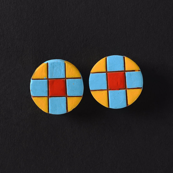 Terracotta literally means ���������baked earth��������� and is made from natural clay, giving it a reddish-brown color.������These jolly and bright earthen earrings here have a modish stud type design with tribal - ethnic vibes . They can be worn with both traditional and ethnic outfits