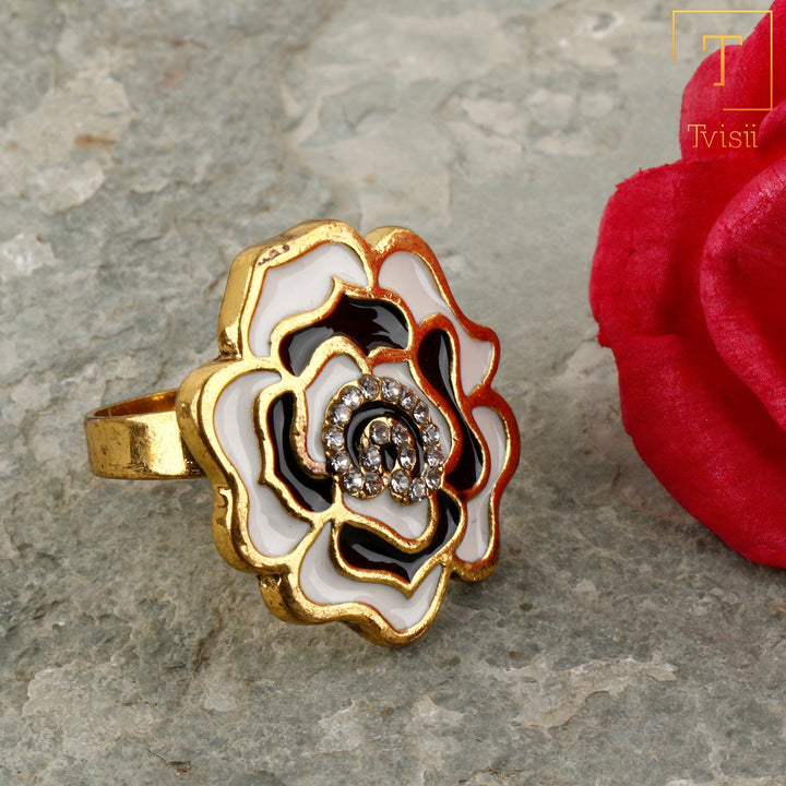 Elevate your style with the Abhira Golden Framed Adjustable Ring, featuring a harmonious blend of white and black hues. Its adjustable design ensures a perfect fit, while the golden frame adds a touch of sophistication. This multicolor ring is a versatile accessory that complements both casual and formal attire, offering expert craftsmanship and lasting elegance.