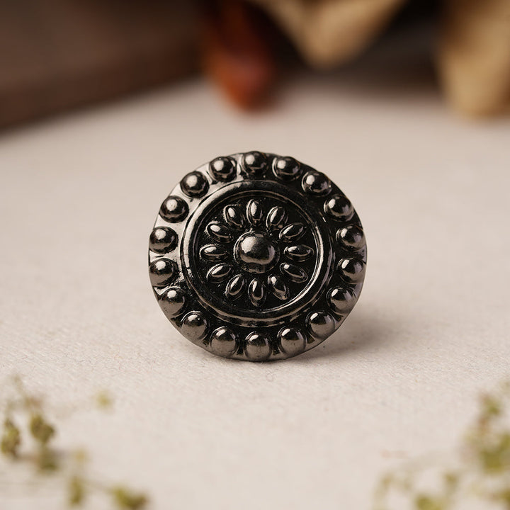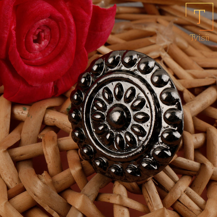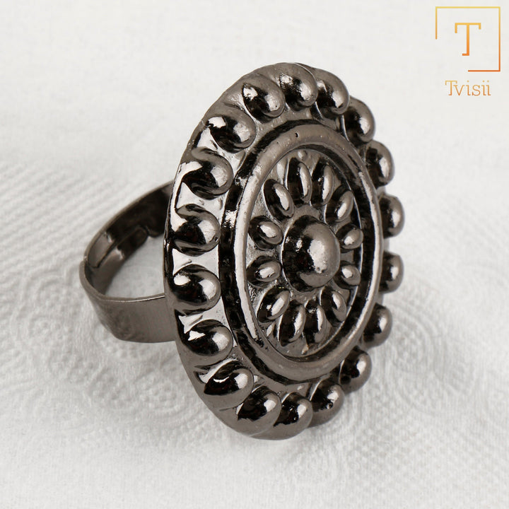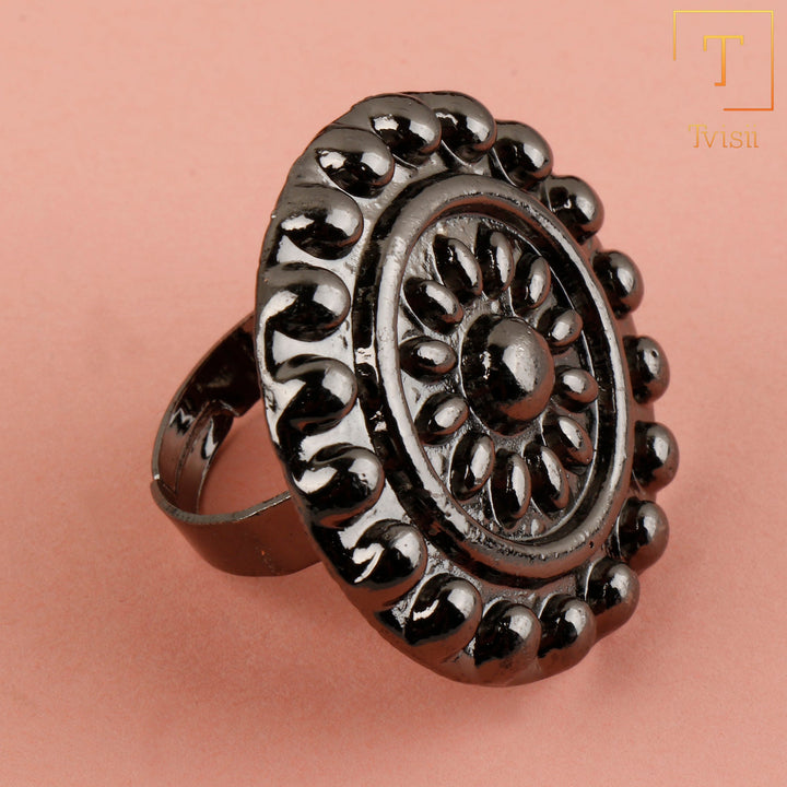 Embrace vintage allure with our oxidised adjustable ring, showcasing intricate patterns and a rustic finish. Perfect for adding a touch of antique charm to your ensemble, this versatile piece effortlessly complements both casual and formal attire with its timeless appeal.