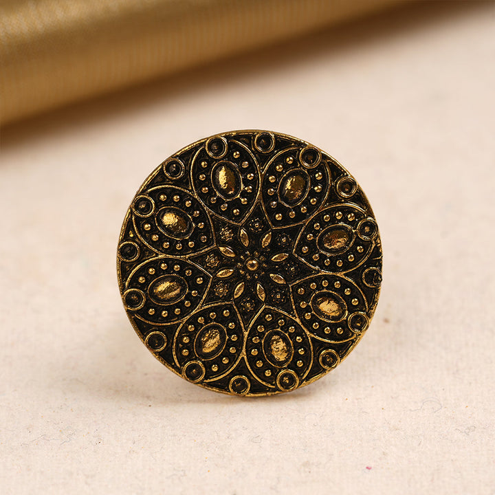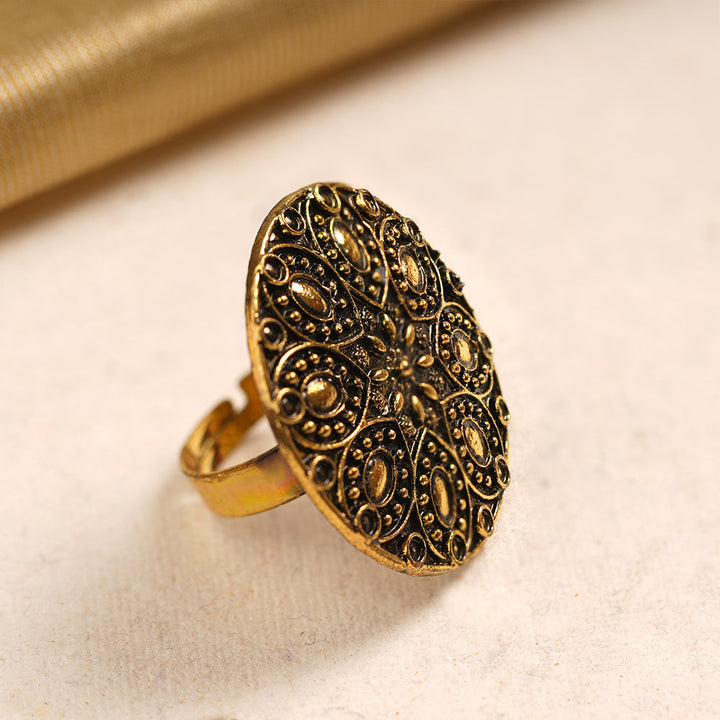 Elevate your accessory collection with the Aparajita Golden Adjustable Ring. Expertly crafted, this ring features a refined golden finish and an adjustable design that ensures a comfortable and perfect fit. Its timeless elegance and versatility make it suitable for both everyday wear and special occasions, adding a subtle yet sophisticated touch to any ensemble.