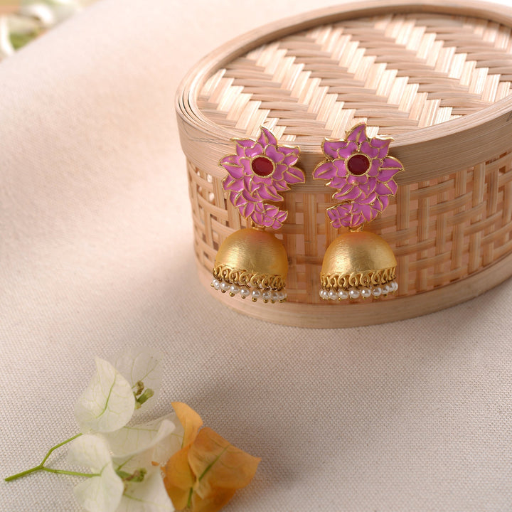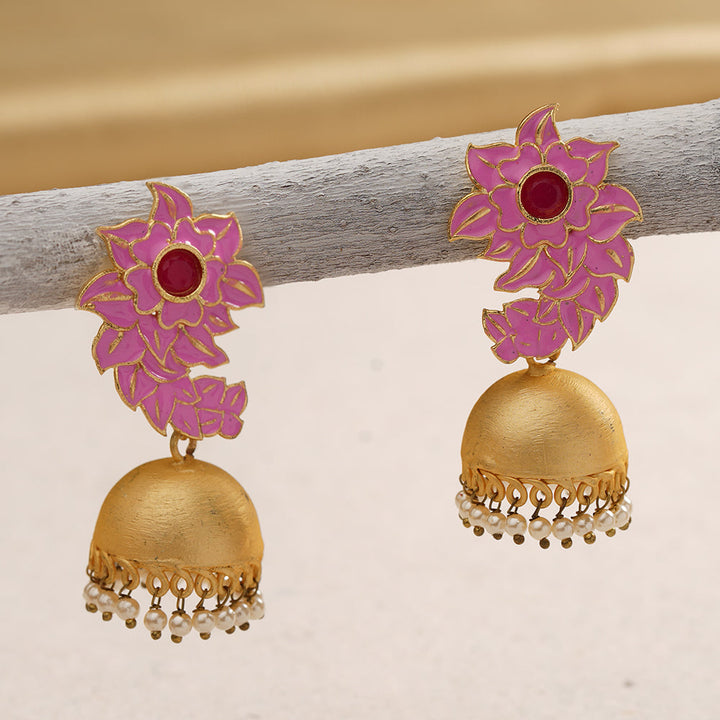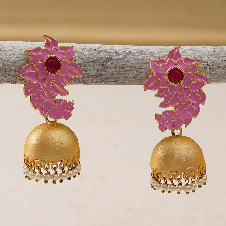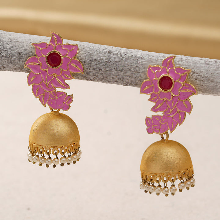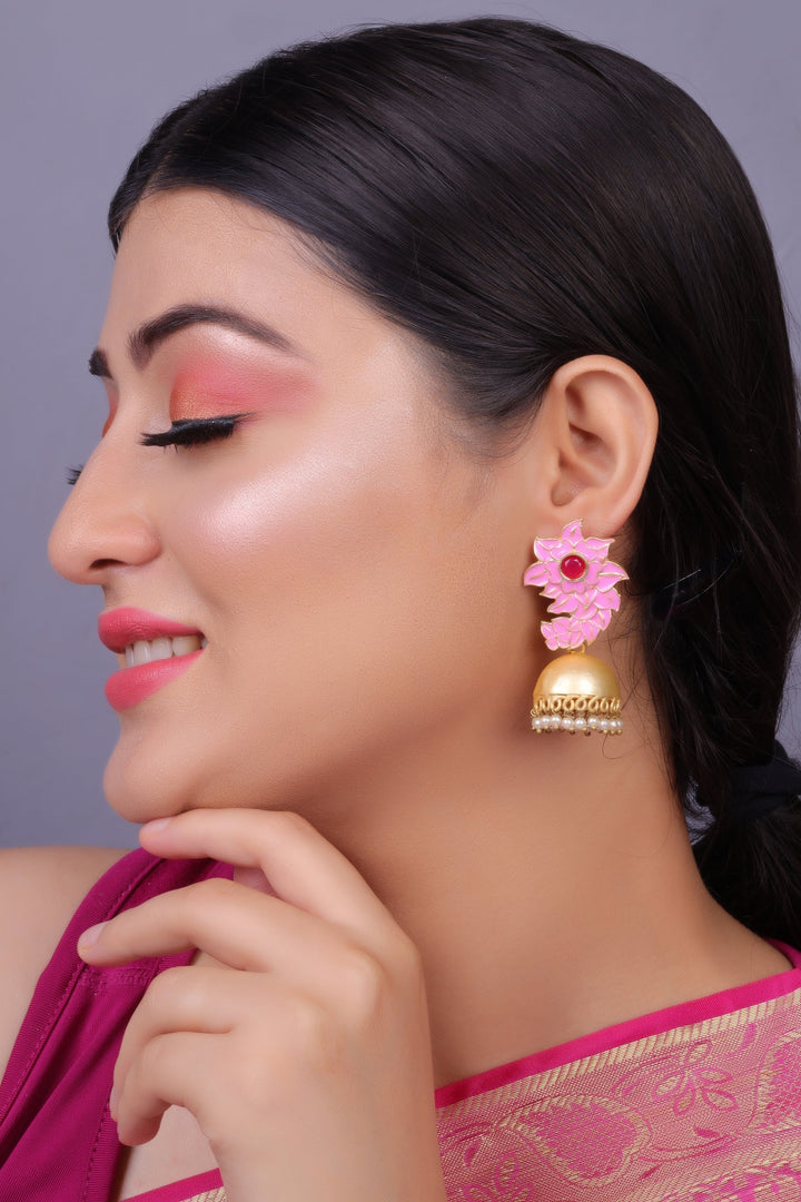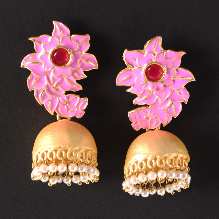 The delightful pink is the official colour for lovely ladies and represents sugar and spice and everything nice.These pink jhumki earrings are so feminine and gorgeous that anyone seeing you with them on is sure to stop and stare .They're worth the attention .The jhumki with pearly ends are the cherry on the cake .Match with salwars , Kurtis ,skirts , traditional tops , sarees