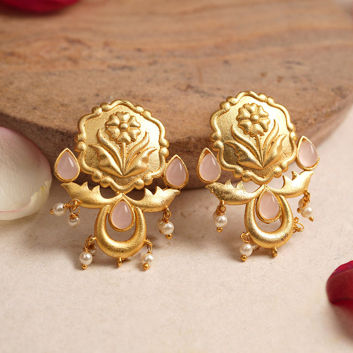Elevate your elegance with the Ritika Stone Studded Hanging Pearls Dangler Earrings in Baby Pink. Expertly crafted, these earrings feature delicately arranged stones that catch the light, complemented by hanging pearls that add graceful movement. Their rich green hue accentuates sophistication, making them ideal for formal occasions or refined everyday wear. Experience a blend of timeless design and expert craftsmanship that enhances your style with subtle charm.