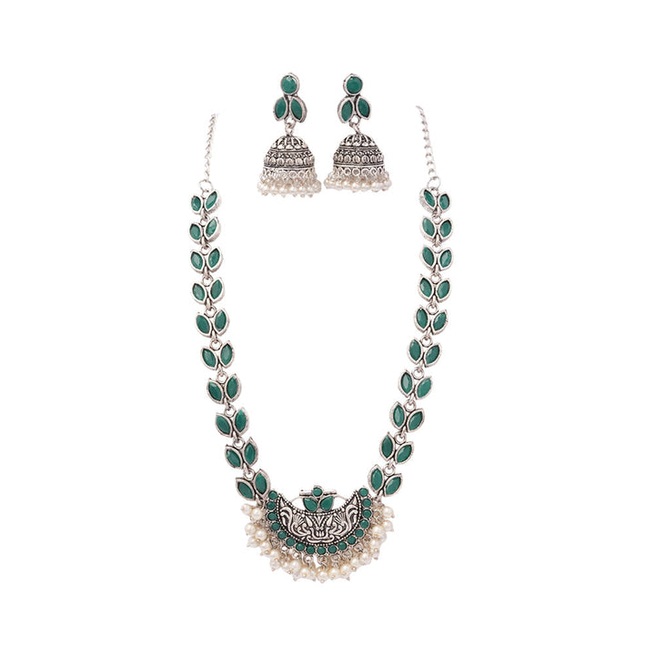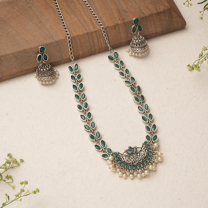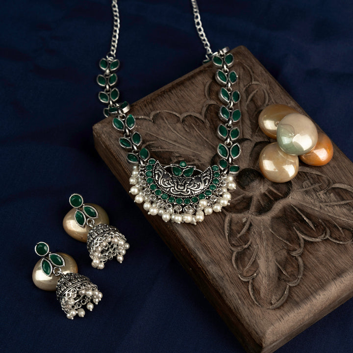 Enhance your look with our green stone studded German silver neckpiece set. Featuring natural beauty and elegant design, it's perfect for adding a touch of luxury to any outfit.
