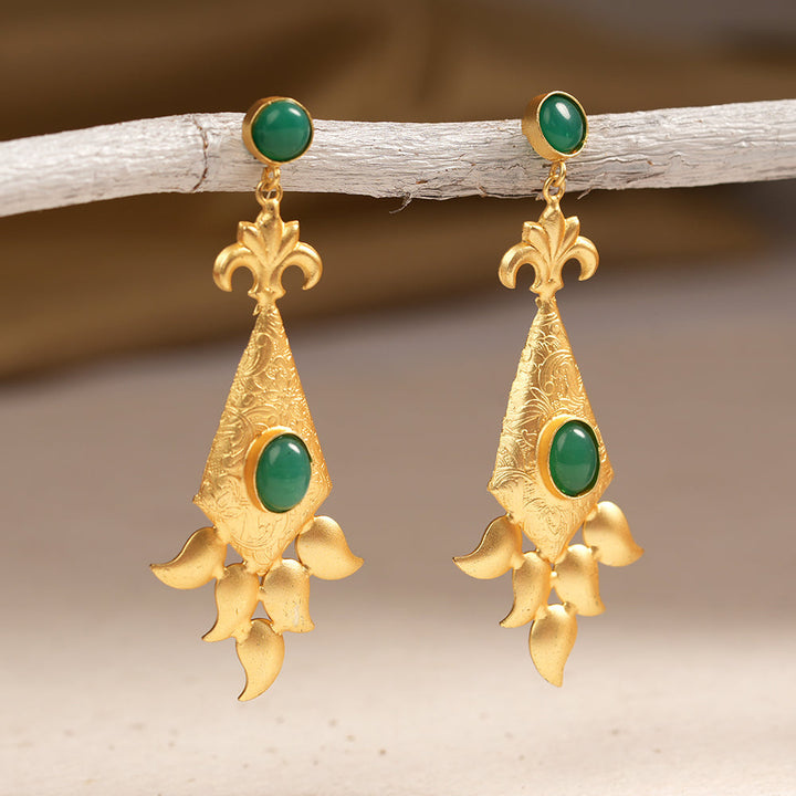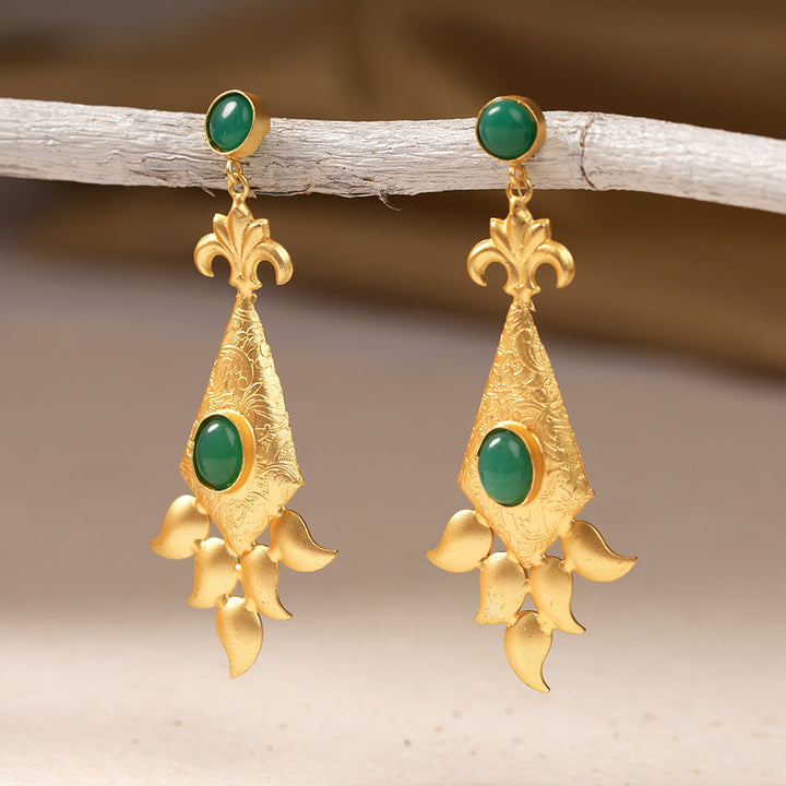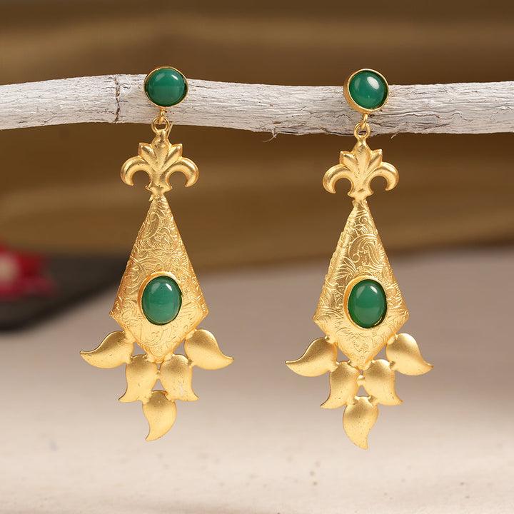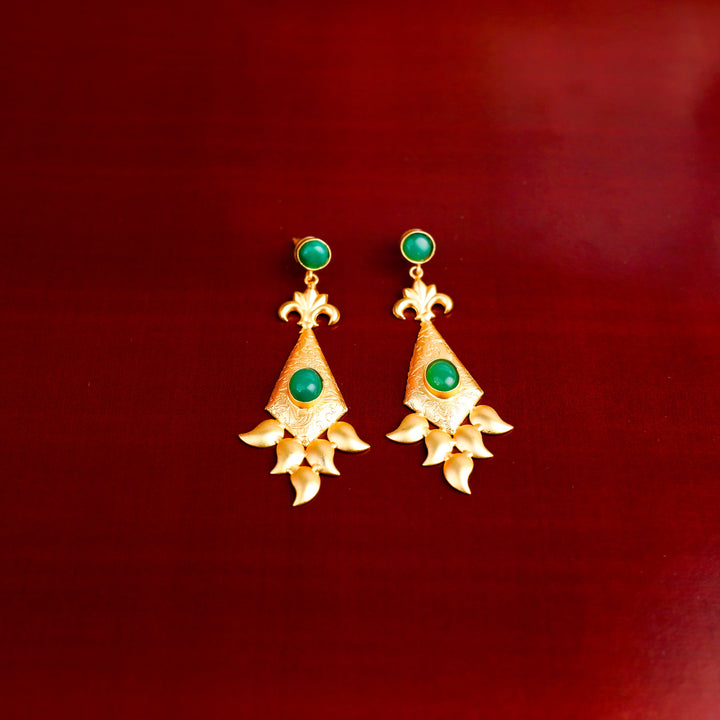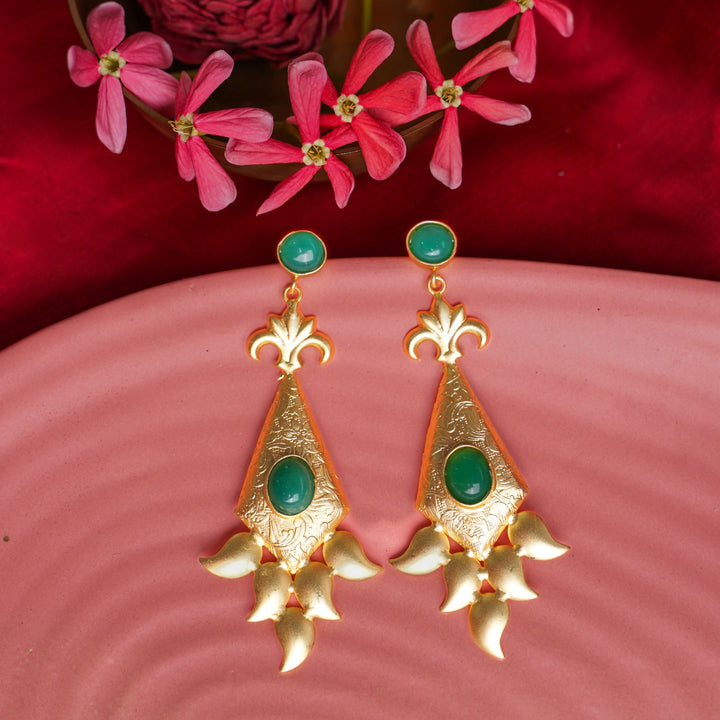 Enhance your elegance with the Ashvi Stone Studded Dangler Earrings in Green. These earrings feature meticulously set black stones that catch the light subtly, adding a sophisticated shimmer to your look. Their lightweight design ensures comfort for extended wear, making them perfect for both formal occasions and stylish everyday use. Elevate your jewelry collection with these expertly crafted danglers that balance classic charm with modern allure.