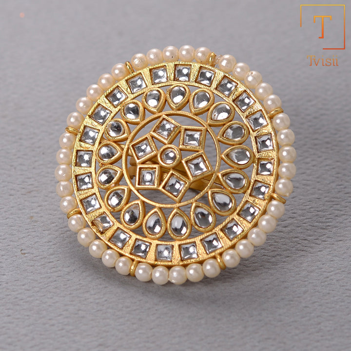 The Swara ring elegantly blends the timeless charm of kundan craftsmanship with delicate pearl accents. Designed for versatility, its adjustable band ensures a comfortable fit while making a refined statement. Ideal for both traditional and contemporary ensembles, this piece highlights expert artistry and attention to detail.