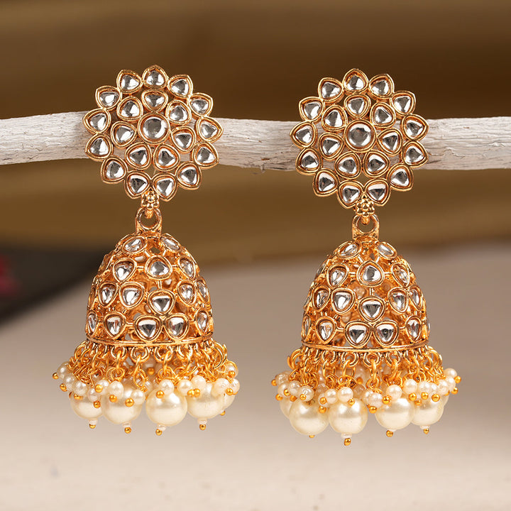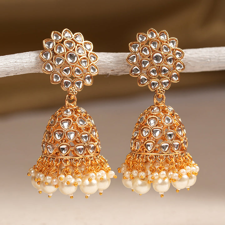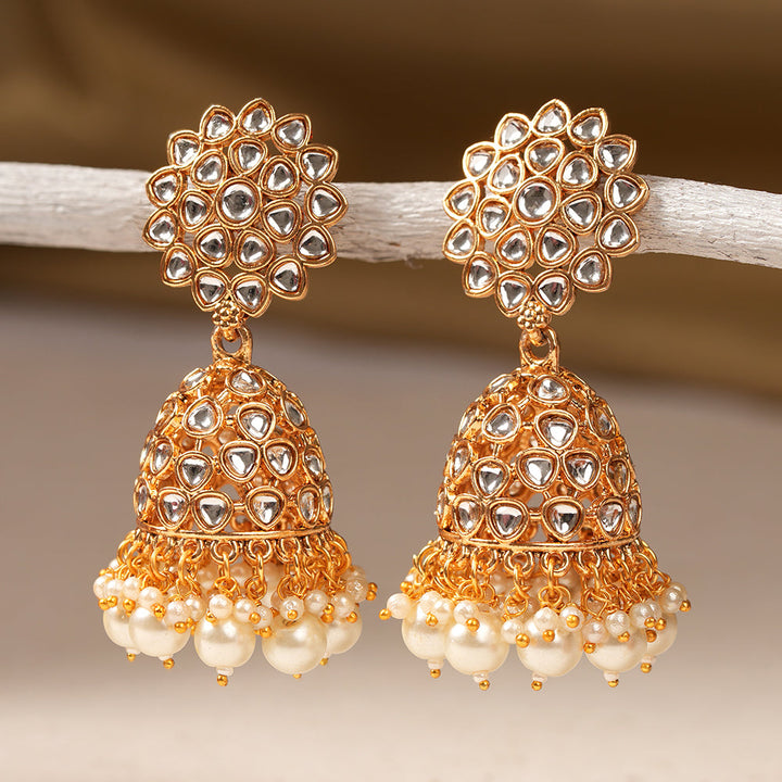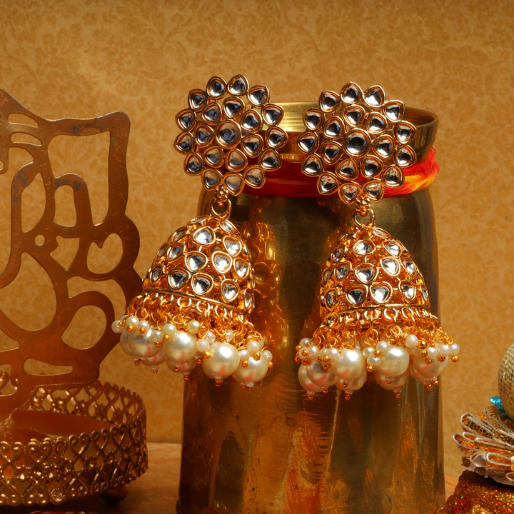 The Ivana Stone Studded Hanging Pearl Jhumki Earrings offer a refined blend of tradition and craftsmanship. Featuring meticulously set stones that add subtle brilliance, these jhumkis are accentuated by elegant hanging pearls for a graceful silhouette. Designed for both comfort and style, they make an excellent choice for enhancing ceremonial or festive outfits with a sophisticated yet timeless appeal.
