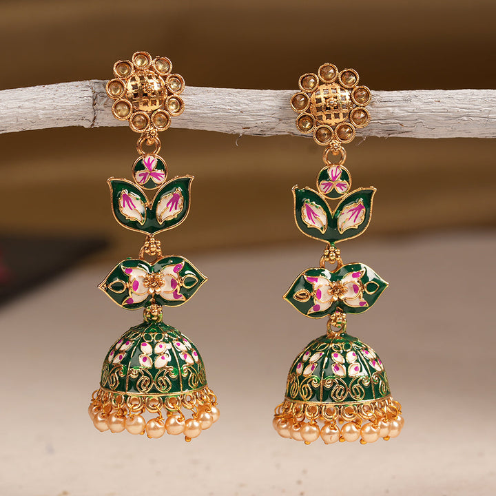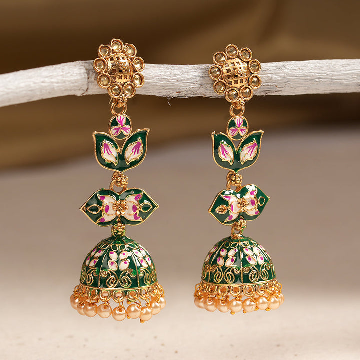 Elevate your traditional collection with the Kalika Stone Studded Hanging Pearl Jhumki Earrings in green. Expertly crafted, these earrings blend intricate stonework with delicate pearls, creating a harmonious balance of elegance and charm. The hanging design ensures graceful movement, perfect for enhancing ethnic wear at weddings or festive occasions. Durable yet lightweight, they offer comfort without compromising on style. A refined choice for those who appreciate detailed craftsmanship and timeless appeal.