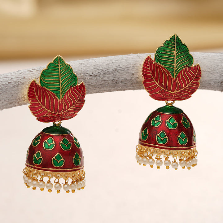 What will the earth be without life-giving herbs, magnificent landscapes, and source of them all, leaves? Inspired by these nature's gift; these earring come in healthy green and striking red colour with painted leaf motifs and splendid matte gold finishing. The innocent pure pearls swinging from the jhumka make them womanlike.