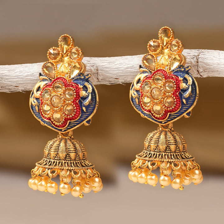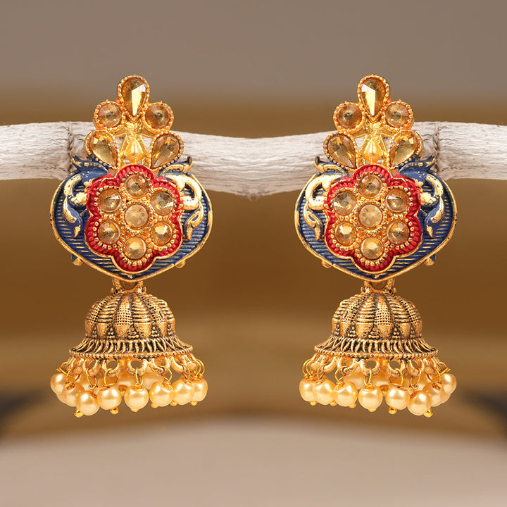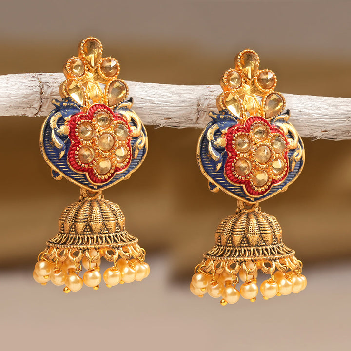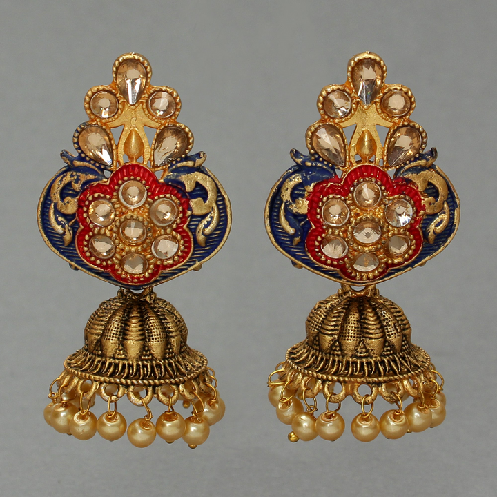 Elevate your traditional ensemble with the Divya Stone Studded Hanging Pearl Jhumka Earrings in Blue. Expertly crafted, these earrings feature intricate stone detailing paired with delicately hanging pearls, adding refined elegance to your look. Ideal for festive occasions, the lightweight design ensures comfortable wear while enhancing your style with a timeless charm.