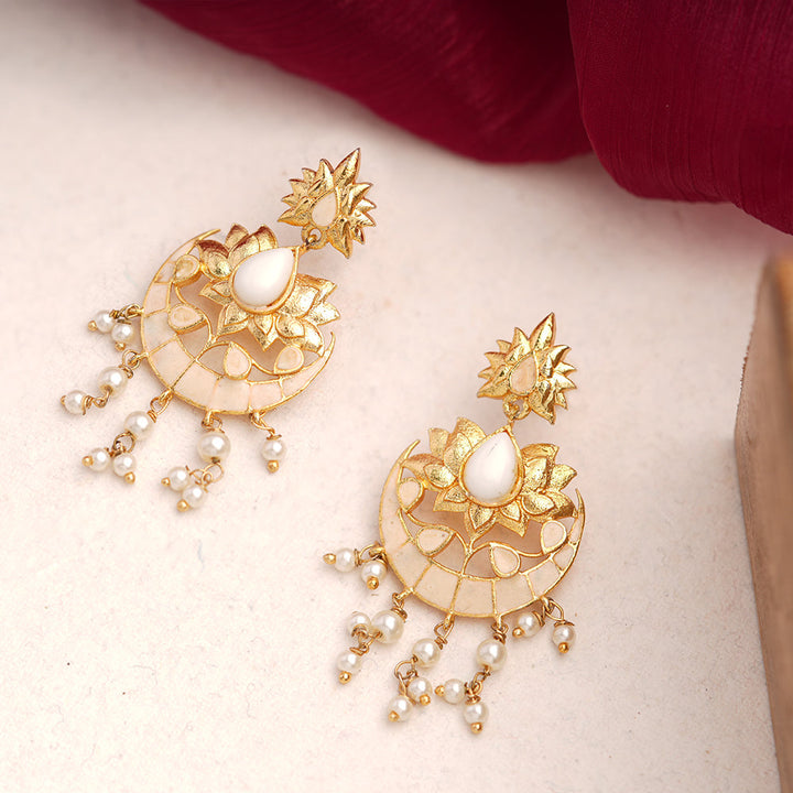 These Vanya Meenakari Hanging Baby Pearls Statement Danglers combine traditional craftsmanship with elegant design. Featuring delicate meenakari work and finely suspended baby pearls, they offer a refined yet striking accessory for special occasions. Expertly crafted to enhance your ensemble, these earrings bring a sophisticated touch with a hint of ethnic charm.