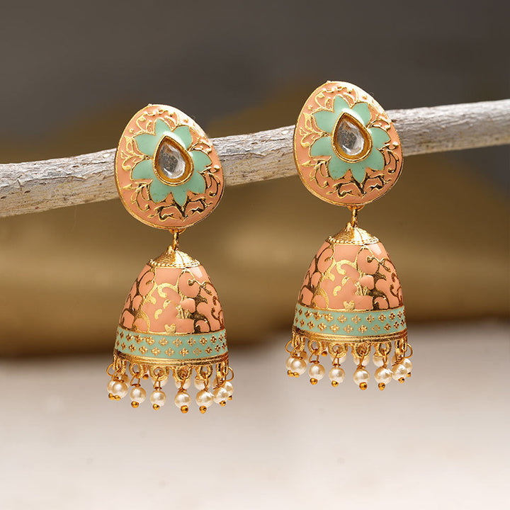 Advika- Stone Studded Hanging Pearls Jhumka Earrings(Peach Puff)