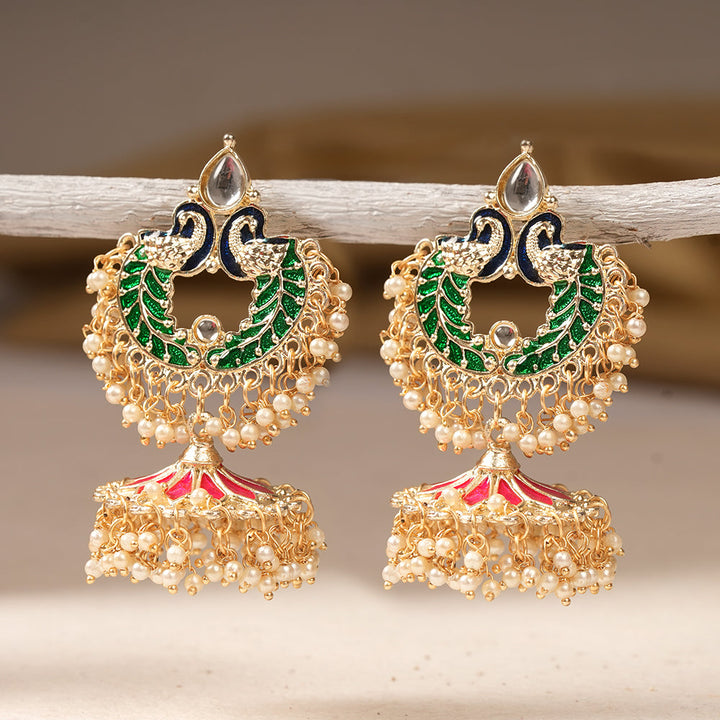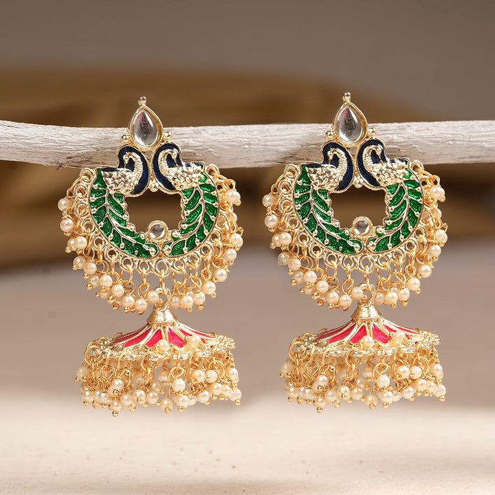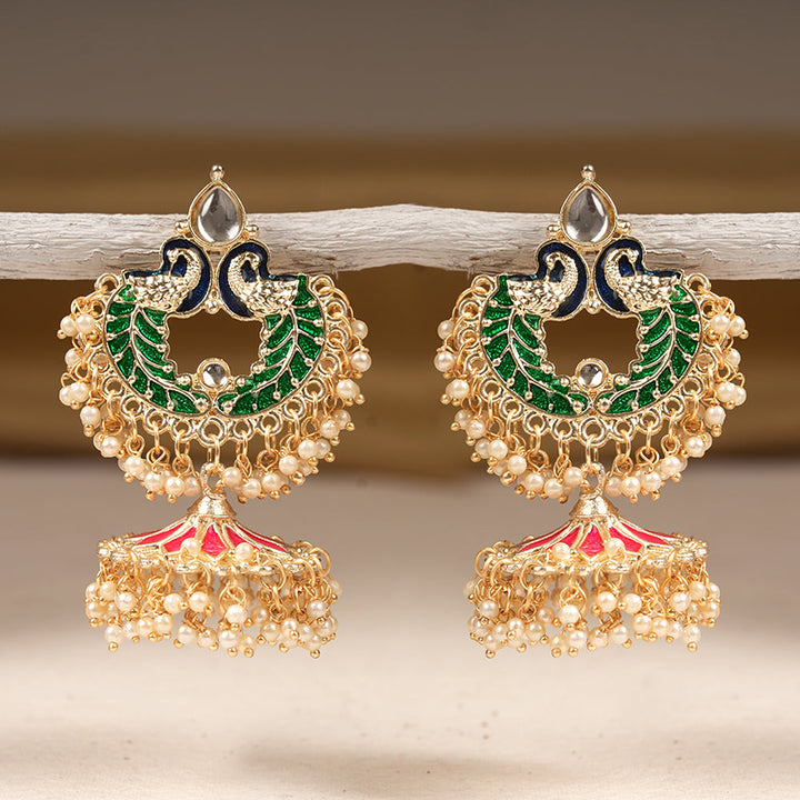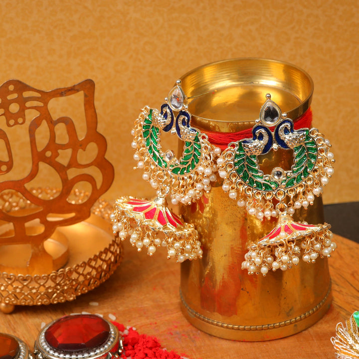 Elevate your style with the Hansini Stone Studded Hanging Pearl Dangler Earrings. Featuring multicolored stones delicately set to catch the light, these earrings are paired with elegant hanging pearls that add a touch of sophistication. Designed for both special occasions and everyday elegance, they offer a refined balance of sparkle and classic charm. Perfectly crafted to enhance your ensemble with expert finesse.