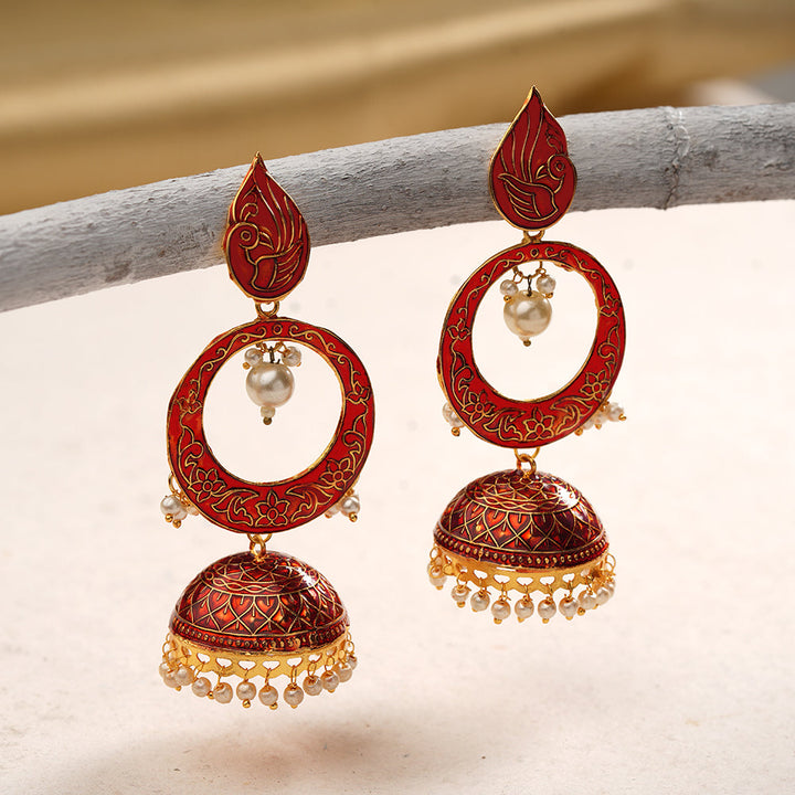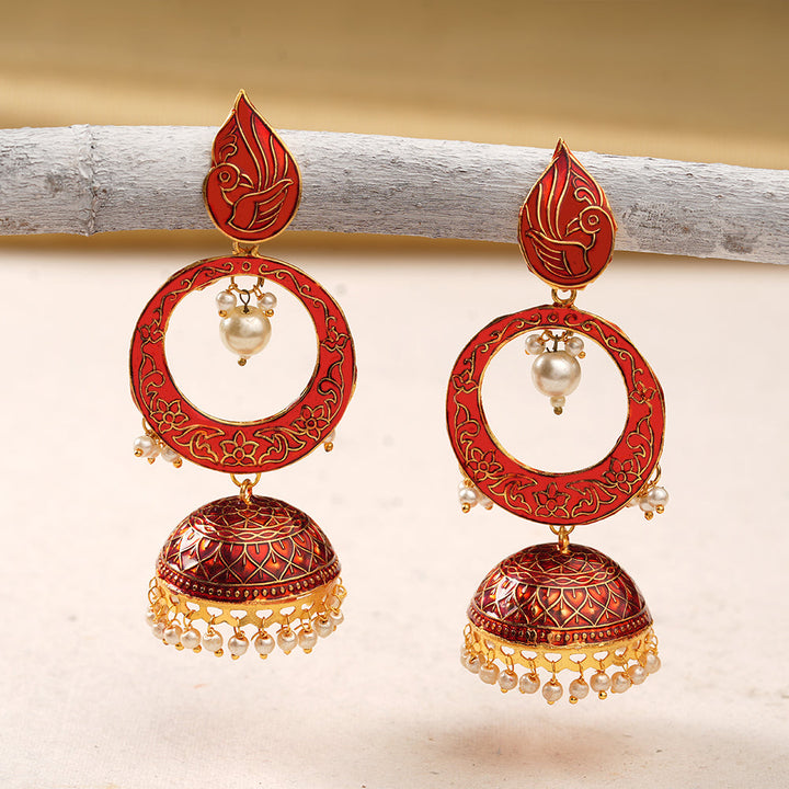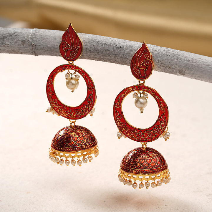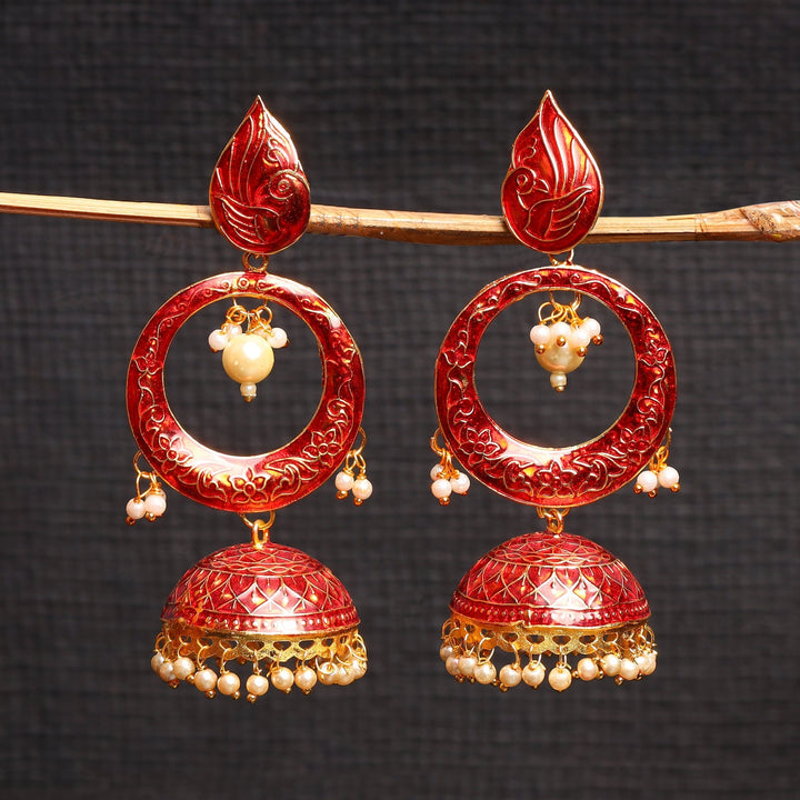 Elevate your traditional ensemble with the Heer Stone Studded Hanging Pearl Jhumka Earrings in Red. These intricately crafted earrings feature a meticulous arrangement of sparkling stones complemented by elegantly suspended pearls, offering a harmonious blend of classic charm and sophistication. Perfect for festive occasions or weddings, they add a refined touch of elegance and vibrant color to your look while ensuring comfortable, secure wear throughout the day.
