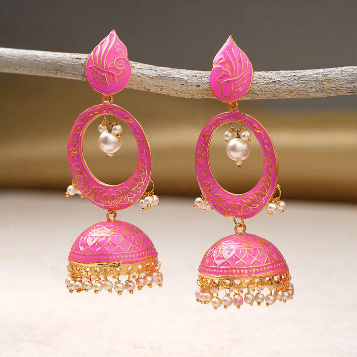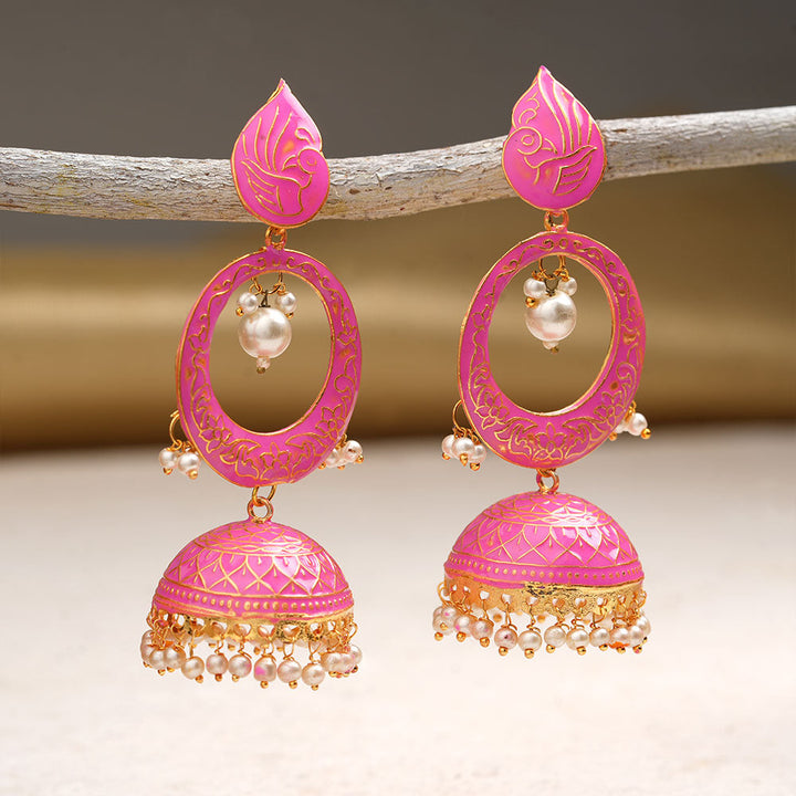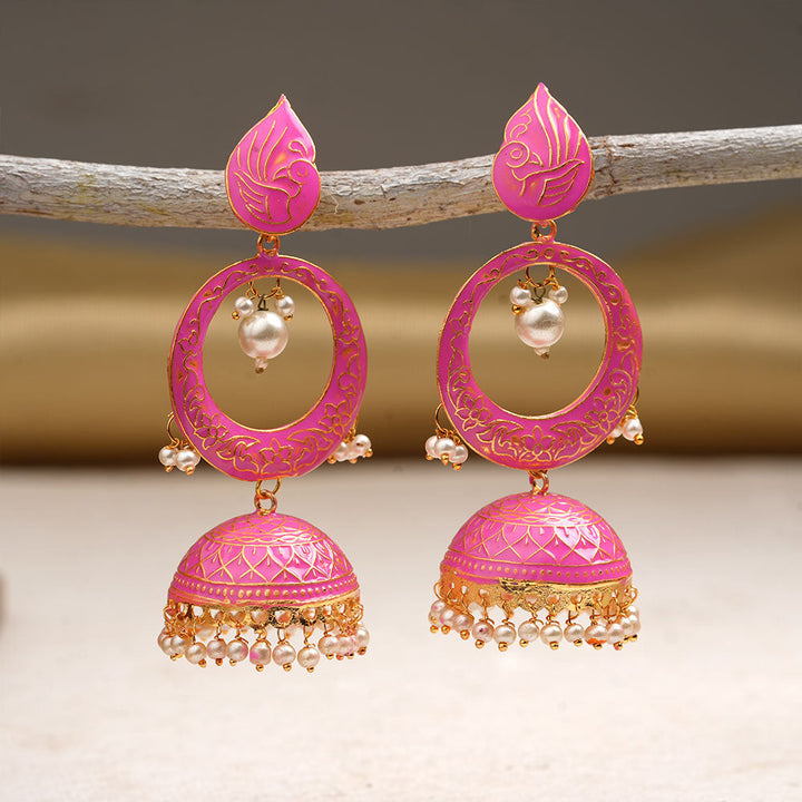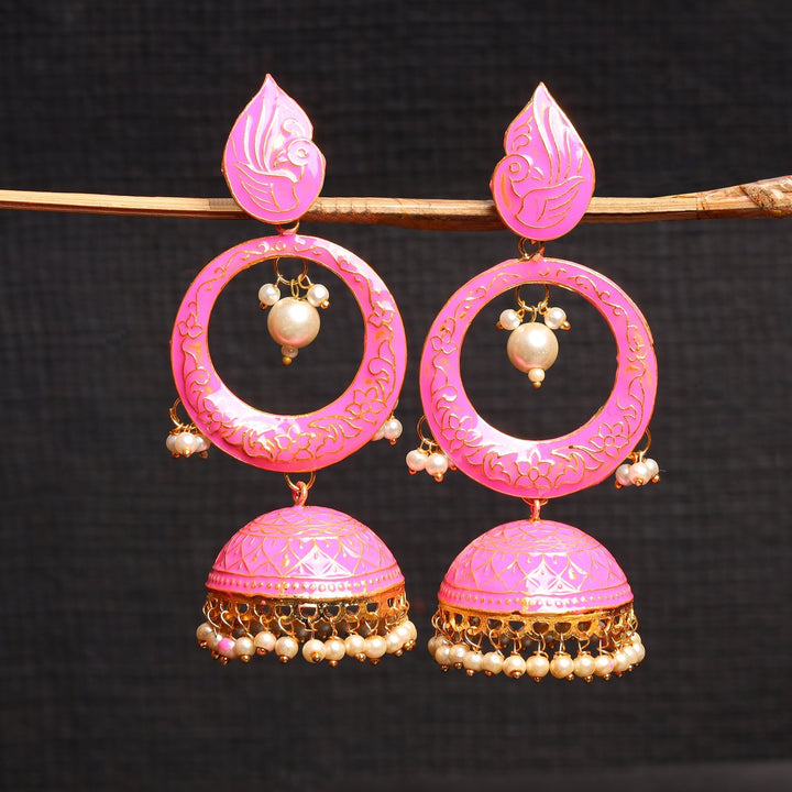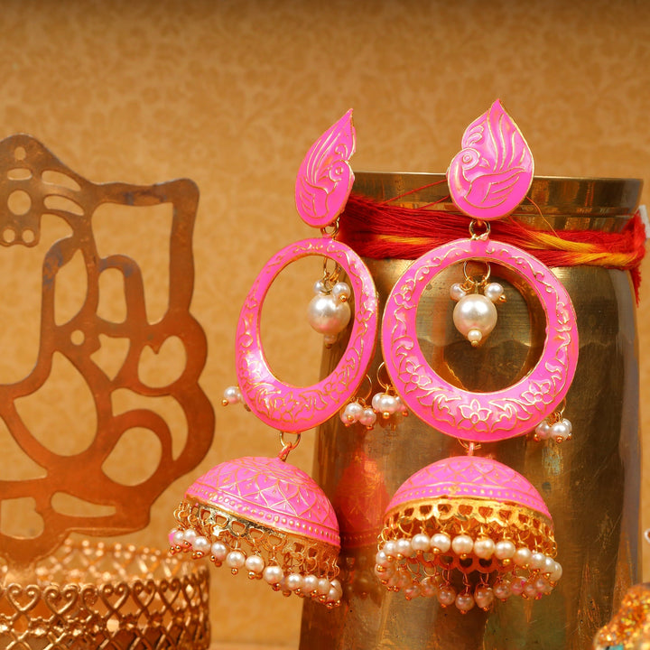 Elevate your traditional ensemble with the Heer Stone Studded Hanging Pearl Jhumka Earrings in Pink. These intricately crafted earrings feature a meticulous arrangement of sparkling stones complemented by elegantly suspended pearls, offering a harmonious blend of classic charm and sophistication. Perfect for festive occasions or weddings, they add a refined touch of elegance and vibrant color to your look while ensuring comfortable, secure wear throughout the day.