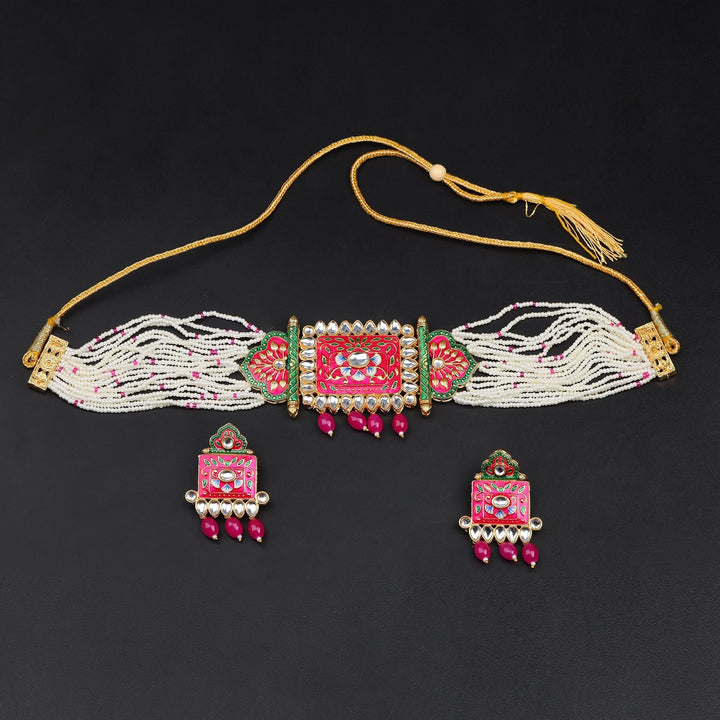 Ishani- Stone Studded Hanging Pearl Beaded Neckpiece Set (Dark Pink)