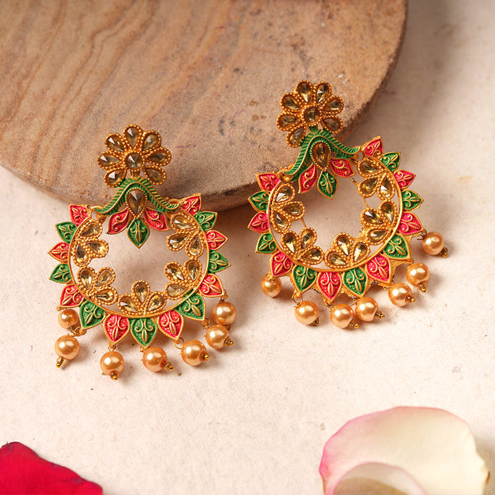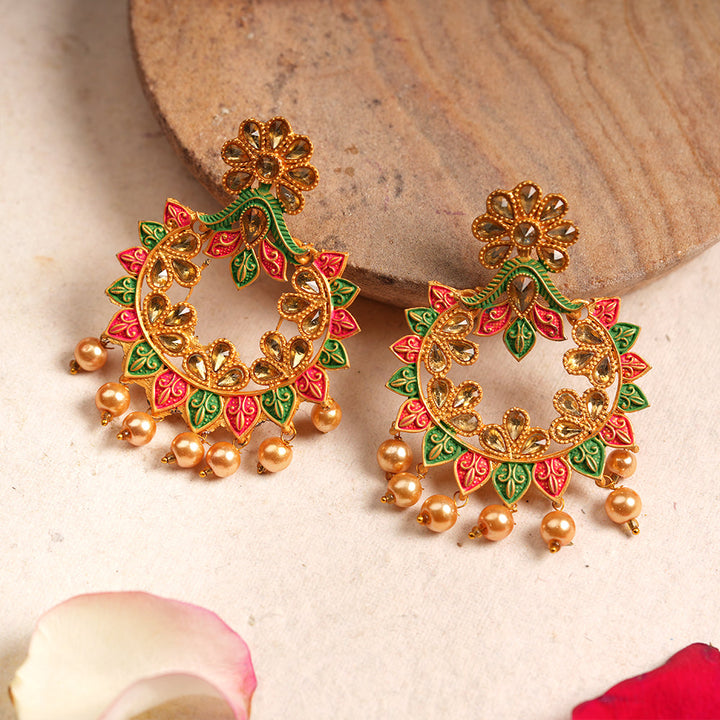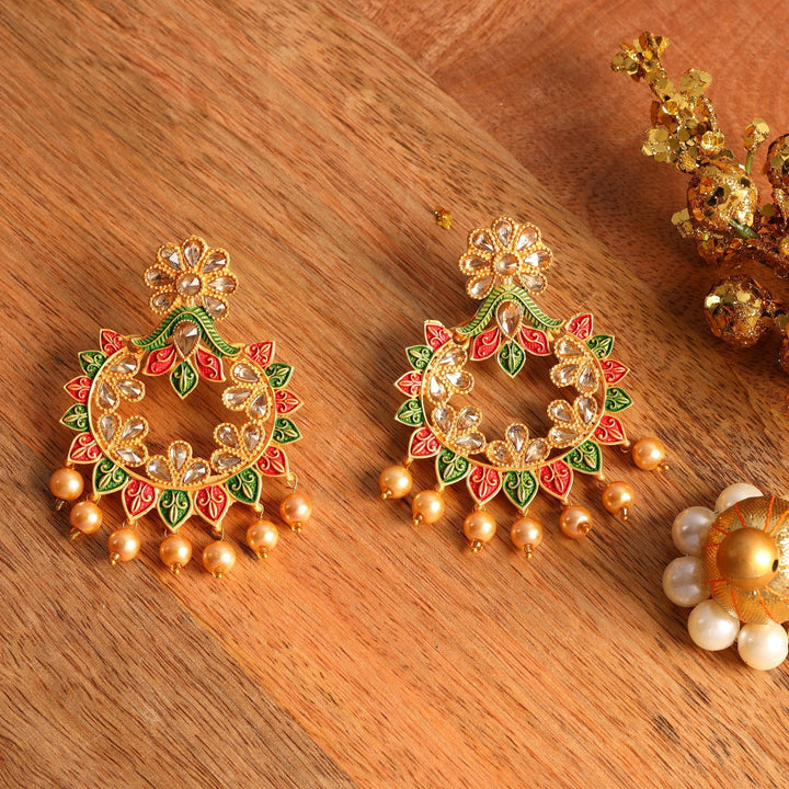 Elevate your style with the Shanaya Meenakari stone-studded hanging pearl dangler earrings. Expertly crafted, these earrings feature intricate Meenakari work combined with delicate stone embellishments and lustrous hanging pearls. Perfectly balancing traditional artistry with contemporary elegance, they enhance any ensemble with a subtle yet sophisticated charm. Ideal for festive occasions or special events, these earrings offer both timeless beauty and refined craftsmanship.