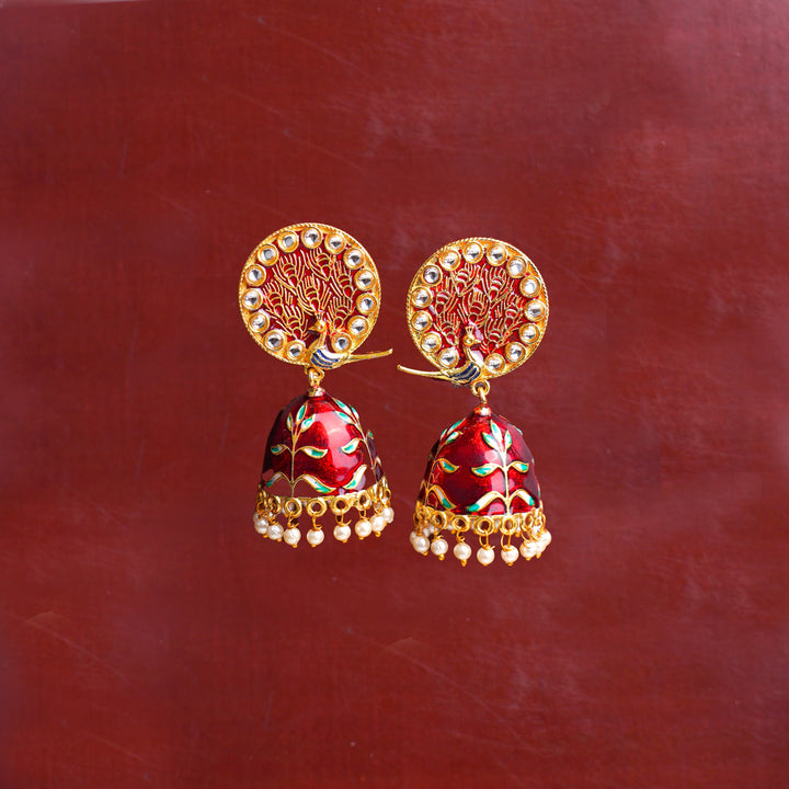 These Meenakari Peacock Earrings feature intricate traditional Indian design. Handcrafted with gold and silver plating, they are a beautiful accessory to any outfit. The meenakari peacock motif is a mark of elegance and sophistication. A classic and timeless piece for any jewelry collection.