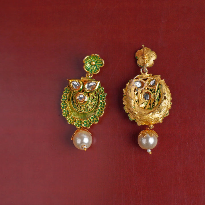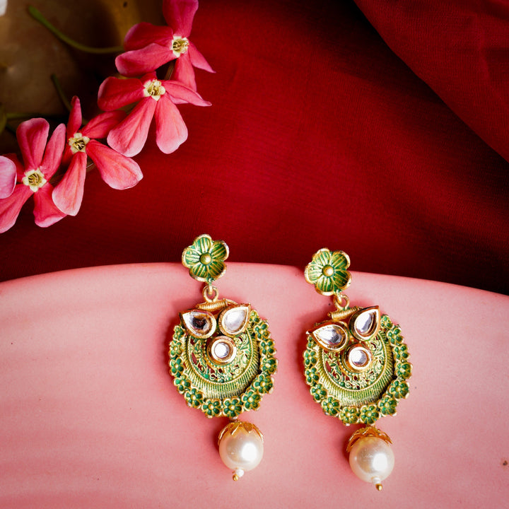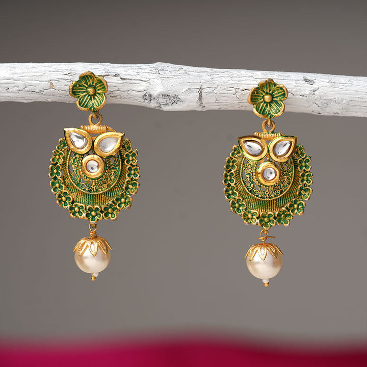 Elevate your ensemble with the Tanirika Stone Studded Hanging Pearl Dangler Earrings in Green. Expertly crafted, these earrings combine shimmering stones with lustrous pearls, offering a graceful balance of sophistication and charm. Their delicate dangle design enhances movement and catches light beautifully, making them ideal for formal occasions or refined everyday wear. Perfect for those seeking a unique touch of elegance grounded in meticulous craftsmanship.