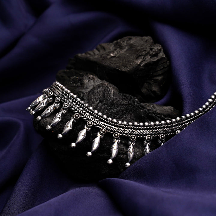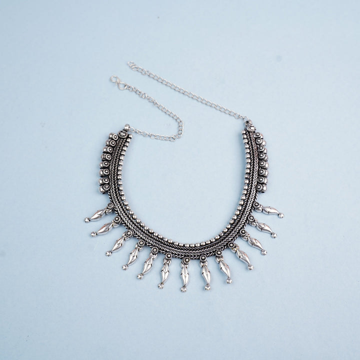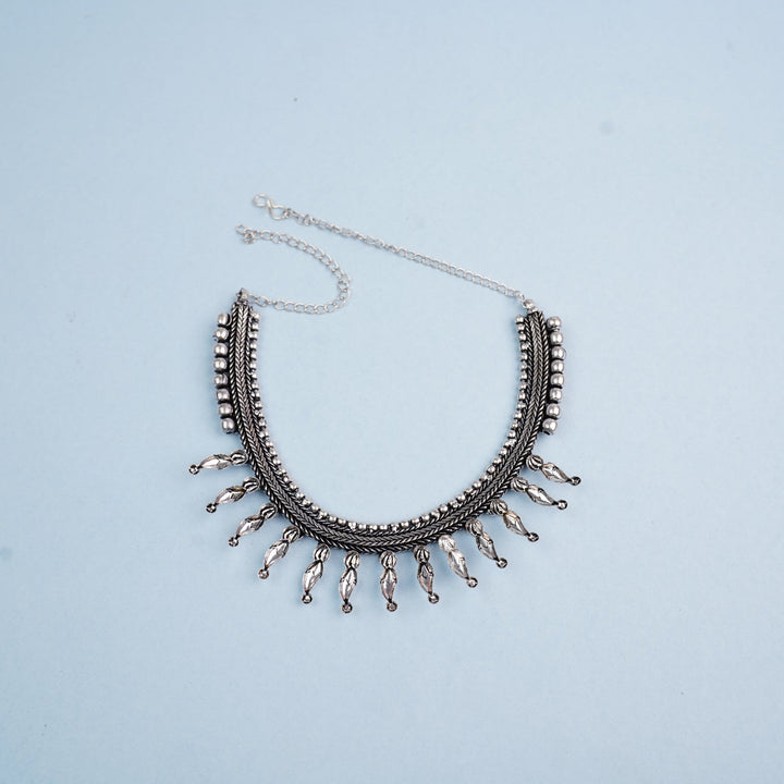 Rustic elegance defines this oxidised necklace. With its vintage-inspired finish and intricate patterns, it's a perfect choice for those who appreciate unique, artisanal jewelry.