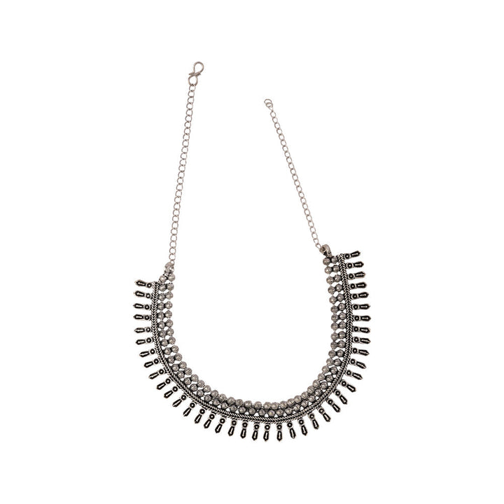 Rustic elegance defines this oxidised necklace. With its vintage-inspired finish and intricate patterns, it's a perfect choice for those who appreciate unique, artisanal jewelry.