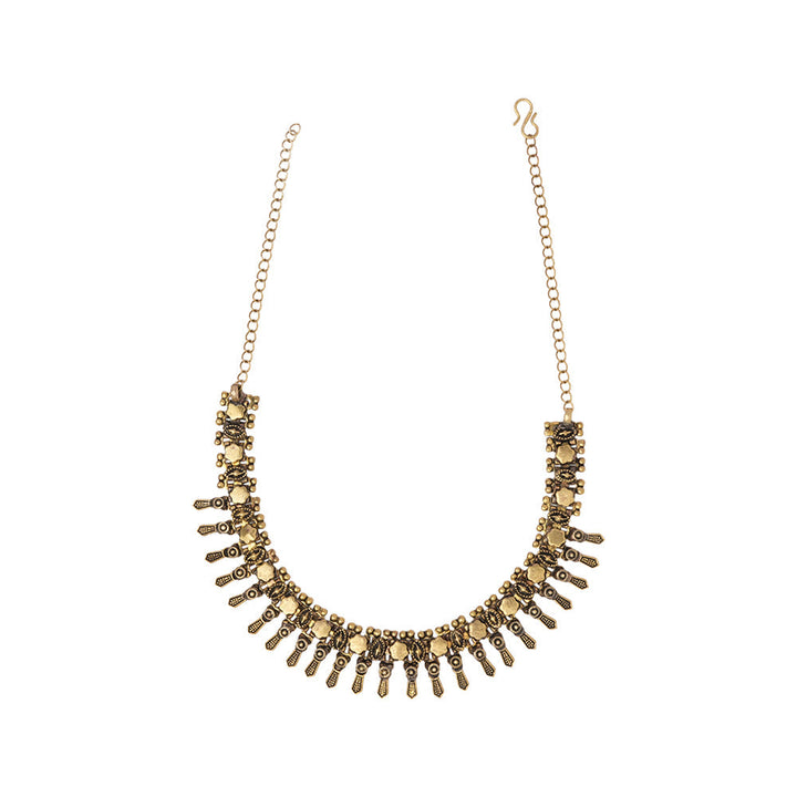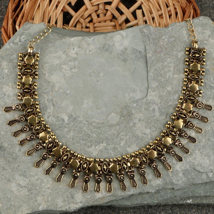 Rustic elegance defines this oxidised necklace. With its vintage-inspired finish and intricate patterns, it's a perfect choice for those who appreciate unique, artisanal jewelry.