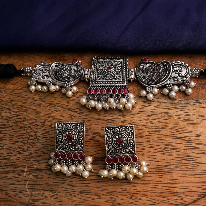 Discover vintage charm with our oxidised neckpiece and earrings set. Perfect for adding a rustic yet elegant touch to your attire, ideal for cultural events and gatherings.