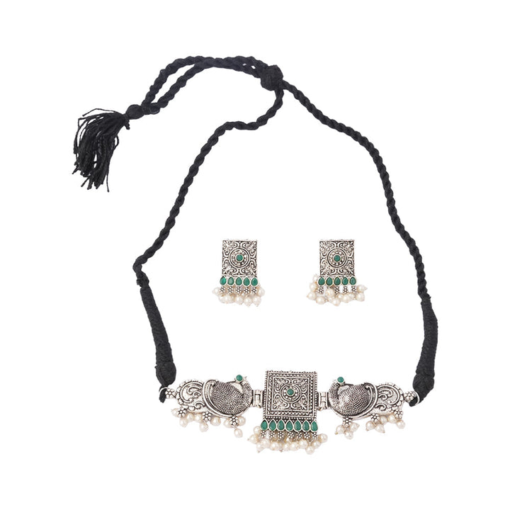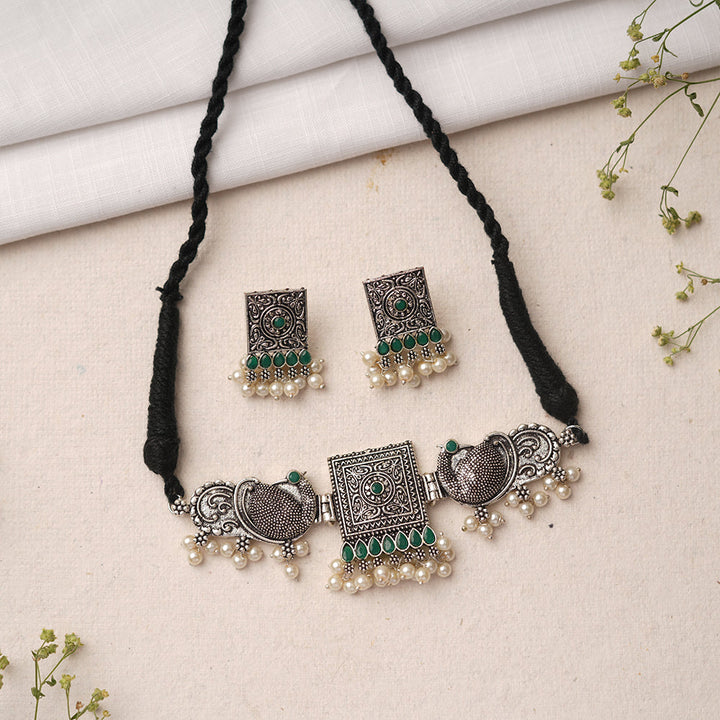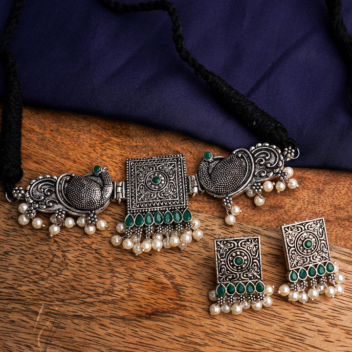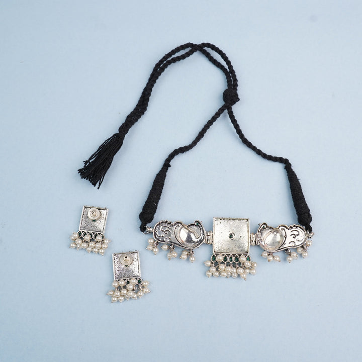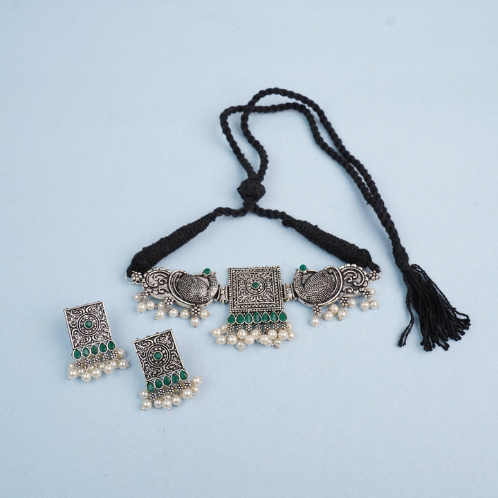 Discover vintage charm with our oxidised neckpiece and earrings set. Perfect for adding a rustic yet elegant touch to your attire, ideal for cultural events and gatherings.