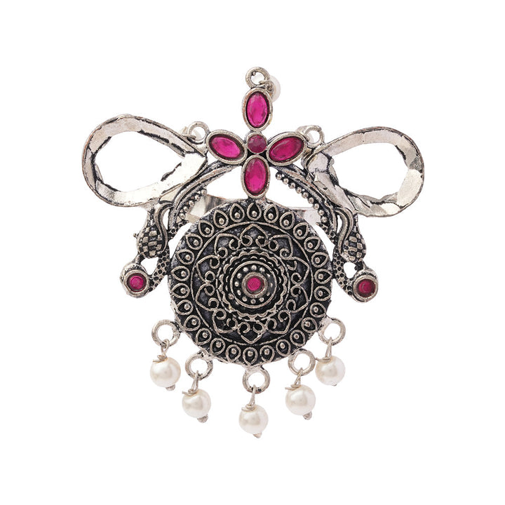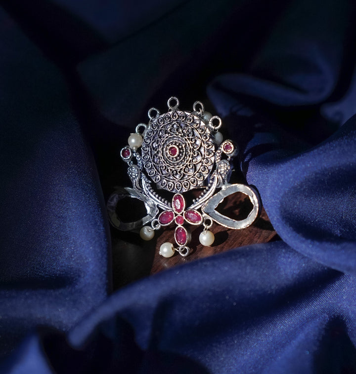 Elegantly oxidised for a vintage look, this ring combines intricate detailing with timeless charm. Perfect for adding a touch of antique elegance to any outfit, it's crafted to enhance your style with its unique design and rustic finish. Ideal for those who appreciate classic yet distinctive jewelry pieces.