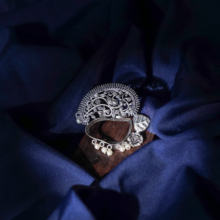 Elegantly oxidised for a vintage look, this ring combines intricate detailing with timeless charm. Perfect for adding a touch of antique elegance to any outfit, it's crafted to enhance your style with its unique design and rustic finish. Ideal for those who appreciate classic yet distinctive jewelry pieces.