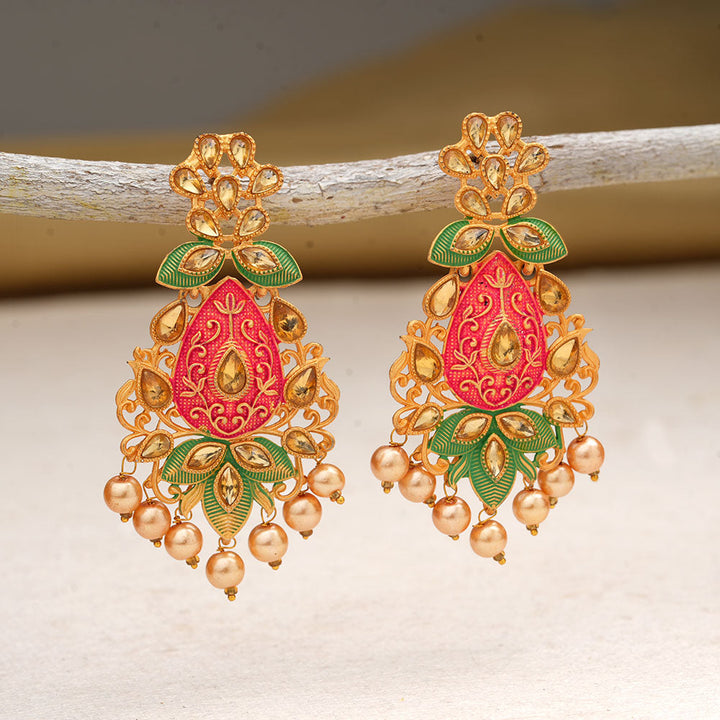 Elevate your style with the Harini Stone Studded Hanging Pearl Dangler Earrings. Featuring a vibrant multicolored design, these earrings blend sparkling stones with elegant hanging pearls for a sophisticated look. Perfect for adding a touch of refined charm to both traditional and contemporary outfits, they offer lightweight comfort without compromising on statement appeal. Ideal for festive occasions and special events, these earrings combine craftsmanship with timeless elegance.