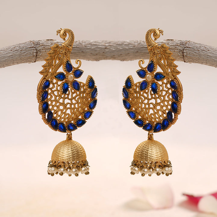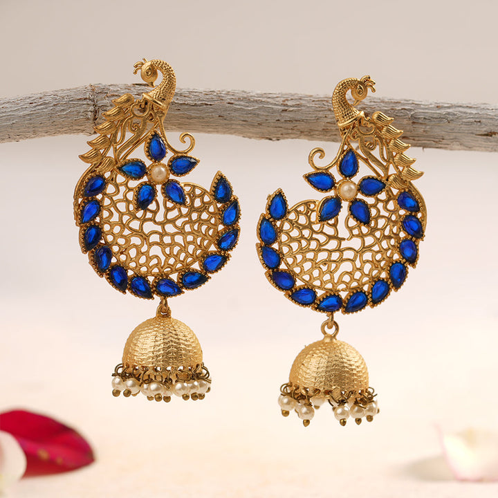 Elevate your traditional ensemble with the Prisha Stone Studded Hanging Pearl Jhumki Earrings in Navy Blue. Expertly crafted, these earrings feature meticulously set stones paired with delicate hanging pearls, creating a refined balance of sparkle and elegance. The deep red hue adds a rich, classic touch, making them ideal for festive occasions or weddings. Designed for comfort and lasting wear, these jhumkis enhance your look with timeless charm and intricate craftsmanship.