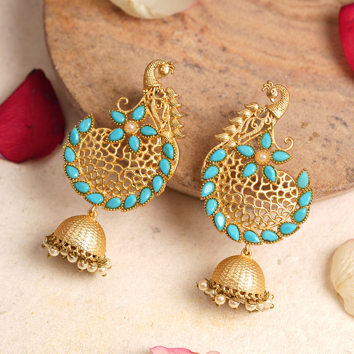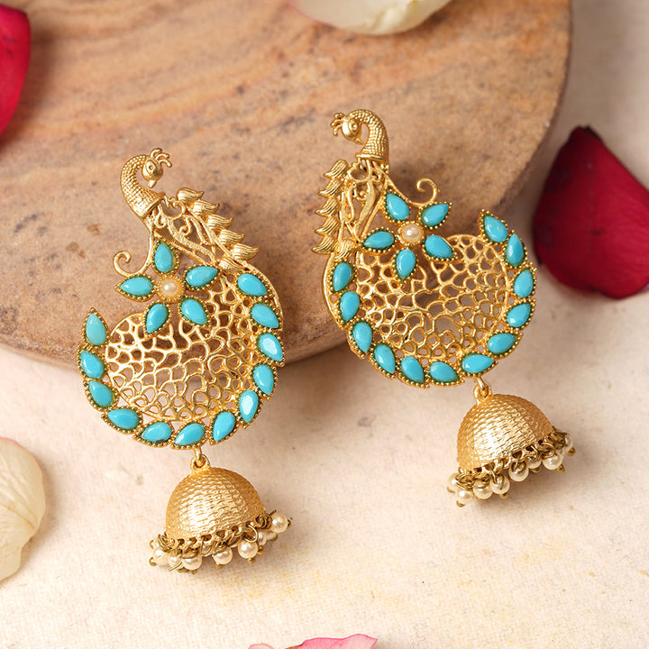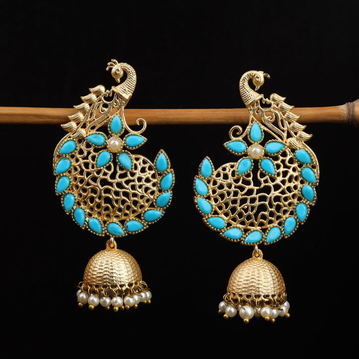 Elevate your traditional ensemble with the Prisha Stone Studded Hanging Pearl Jhumki Earrings in Sky Blue. Expertly crafted, these earrings feature meticulously set stones paired with delicate hanging pearls, creating a refined balance of sparkle and elegance. The deep red hue adds a rich, classic touch, making them ideal for festive occasions or weddings. Designed for comfort and lasting wear, these jhumkis enhance your look with timeless charm and intricate craftsmanship.