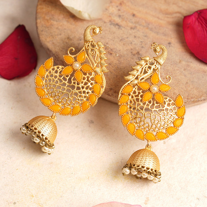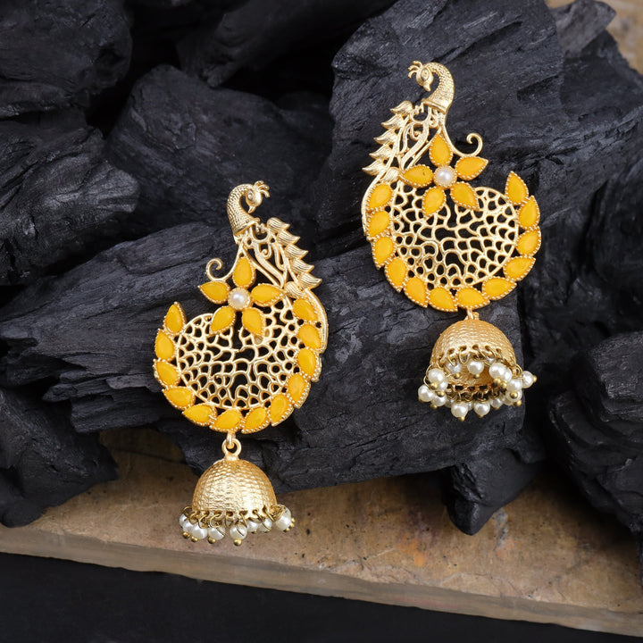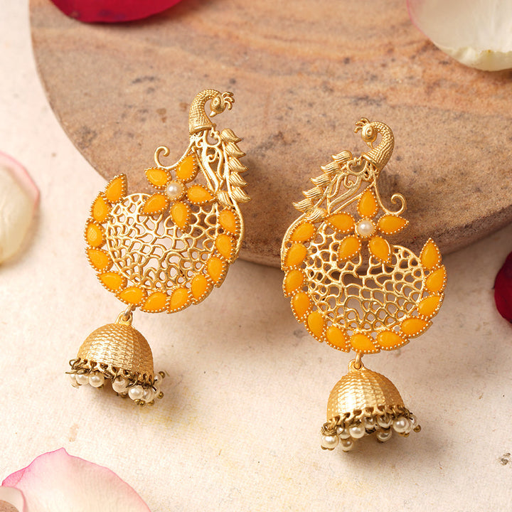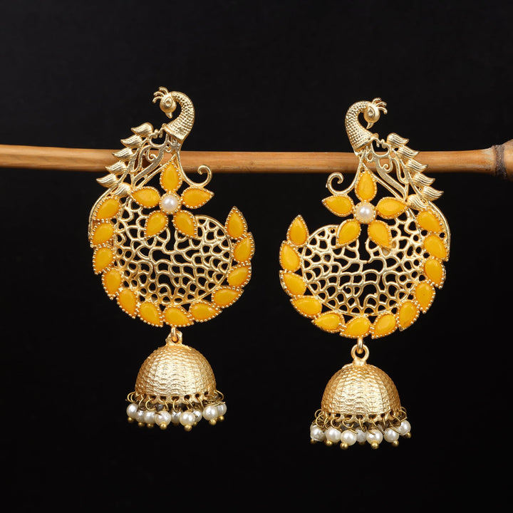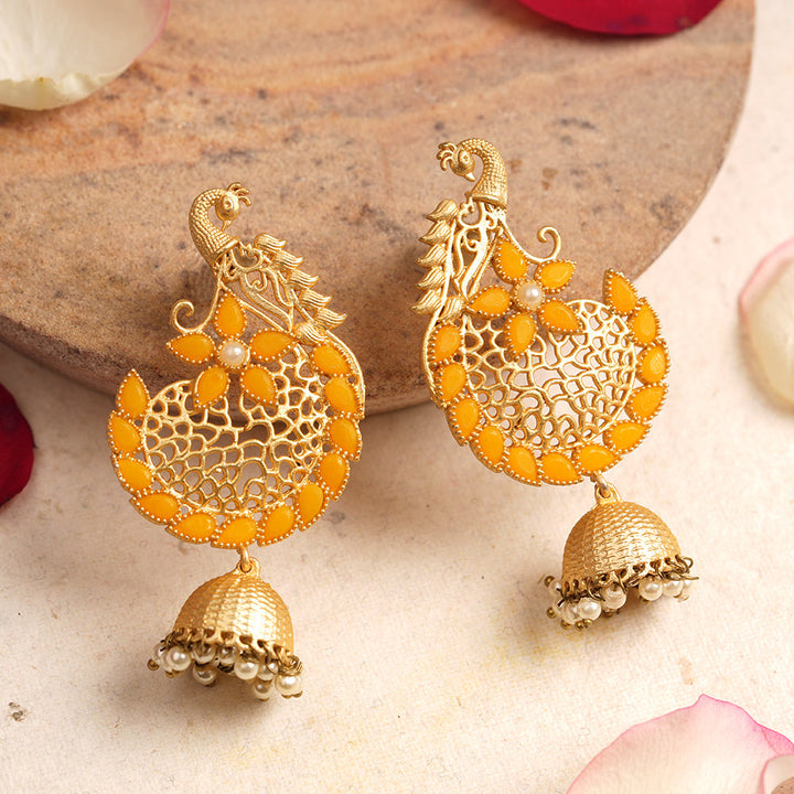 Elevate your traditional ensemble with the Prisha Stone Studded Hanging Pearl Jhumki Earrings in Yellow. Expertly crafted, these earrings feature meticulously set stones paired with delicate hanging pearls, creating a refined balance of sparkle and elegance. The deep red hue adds a rich, classic touch, making them ideal for festive occasions or weddings. Designed for comfort and lasting wear, these jhumkis enhance your look with timeless charm and intricate craftsmanship.