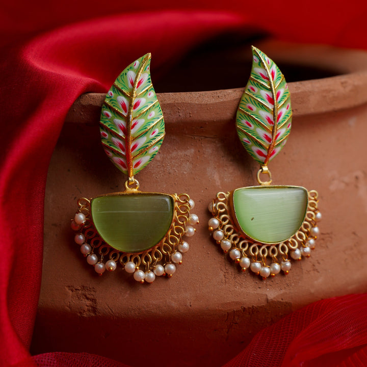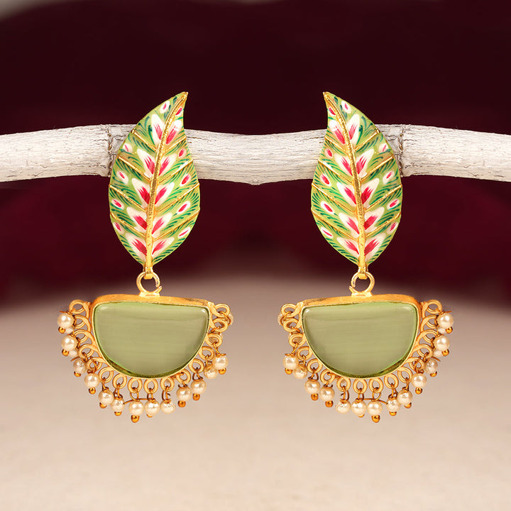 Elevate your ensemble with the Aashi Stone Studded Dangler Earrings in Pale Green. Expertly crafted, these earrings feature delicately set stones that catch light beautifully, adding a subtle yet sophisticated shimmer. Their pale green hue offers a unique, refreshing touch, perfect for enhancing both casual and formal looks with refined elegance. Lightweight and designed for comfortable wear, these danglers are an excellent choice for those seeking understated luxury.