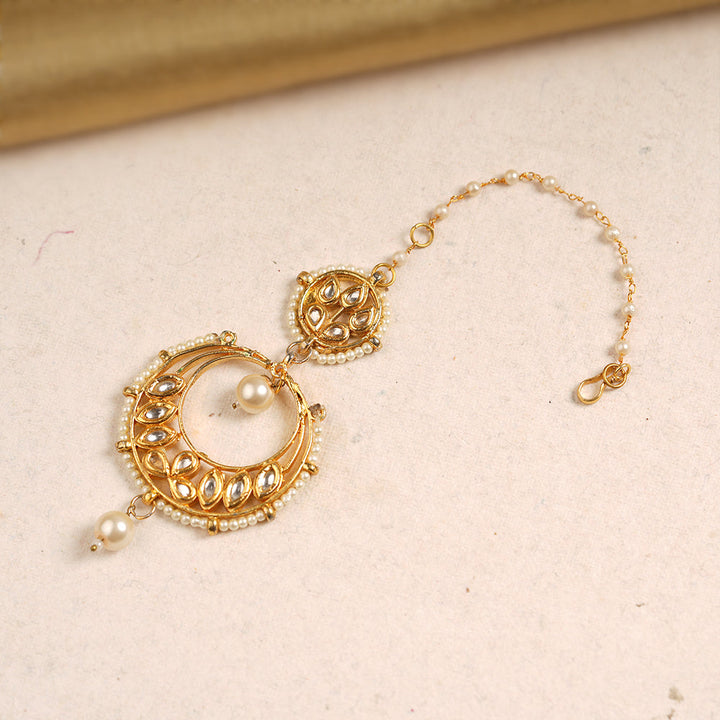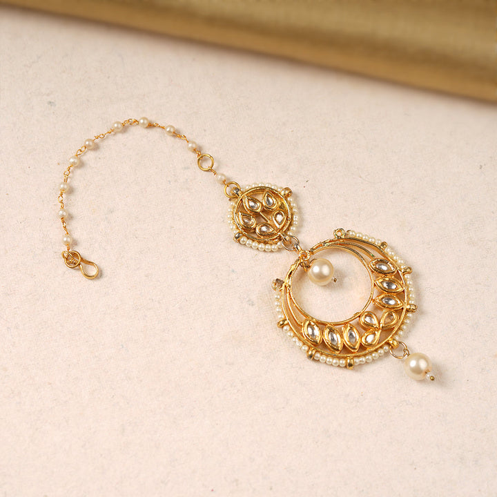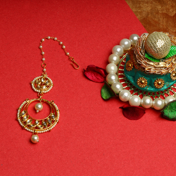 Elevate your traditional look with the Priyanka Stone Studded Hanging Pearl Mangtikka. Expertly crafted, this exquisite piece features sparkling stones delicately set to enhance the elegant hanging pearl design. Perfect for special occasions, it adds a refined touch to any ensemble, highlighting your grace and style with timeless charm.