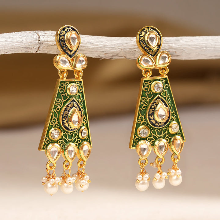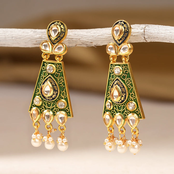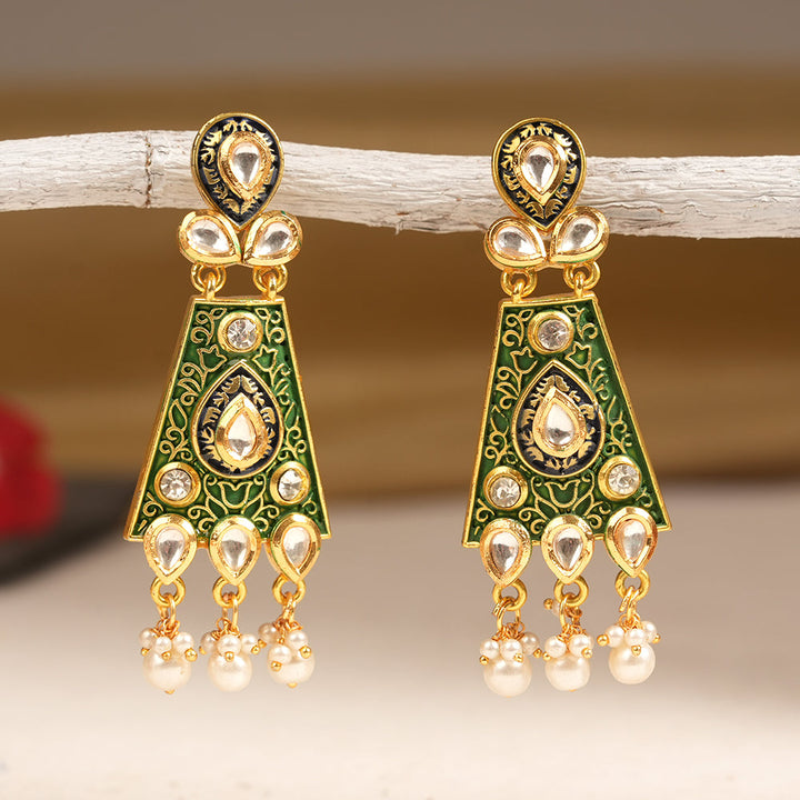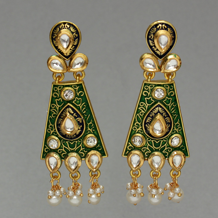 Elevate your elegance with the Eesha Stone Studded Hanging Pearl Dangler Earrings. Expertly crafted, these earrings combine sparkling stones and lustrous pearls in a graceful design that complements both traditional and contemporary styles. Their lightweight construction ensures comfortable wear, making them ideal for special occasions or daily sophistication. A refined accessory that enhances your ensemble with subtle shimmer and timeless charm.