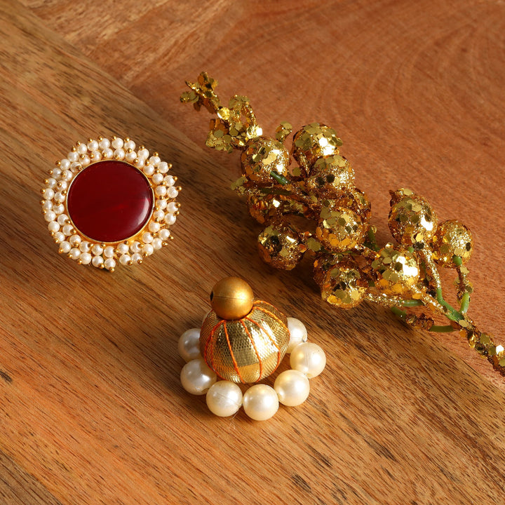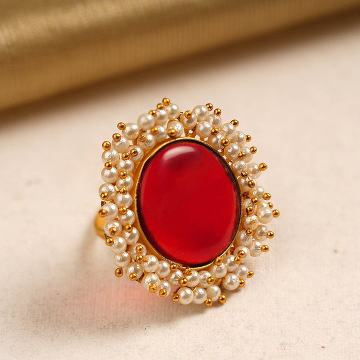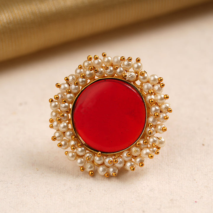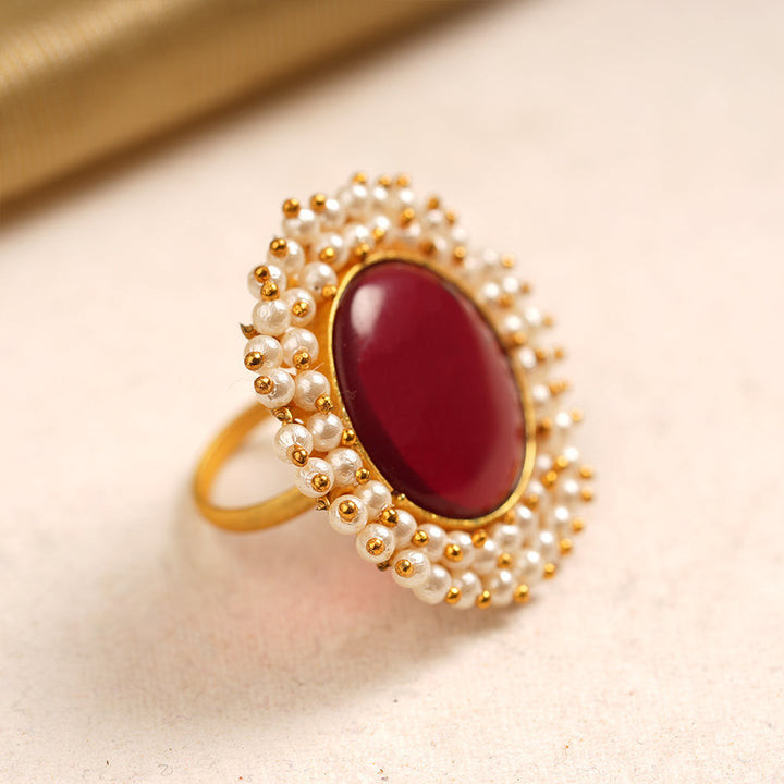 Elevate your elegance with the Bhavya Stone Studded Pearl Framed Ring in Red. This expertly crafted piece features delicately set stones surrounding lustrous pearls, creating a refined and sophisticated look. Perfect for special occasions or adding a touch of luxury to everyday wear, this ring combines timeless design with subtle color accents for a graceful statement.