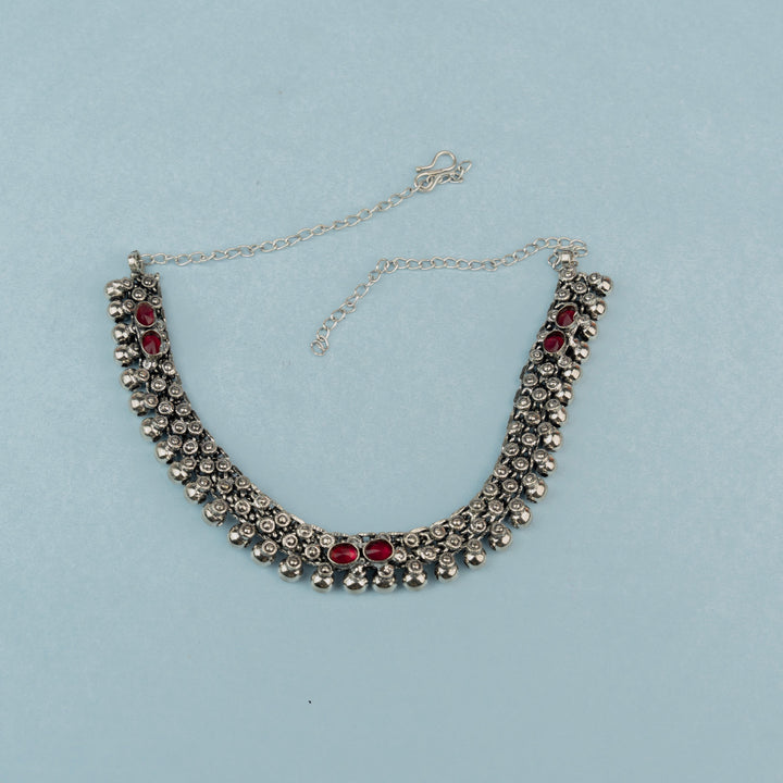 Embrace sophistication with our red stone brass neckpiece. Featuring rich red stones and intricate detailing, it adds a touch of luxury and elegance to any outfit.