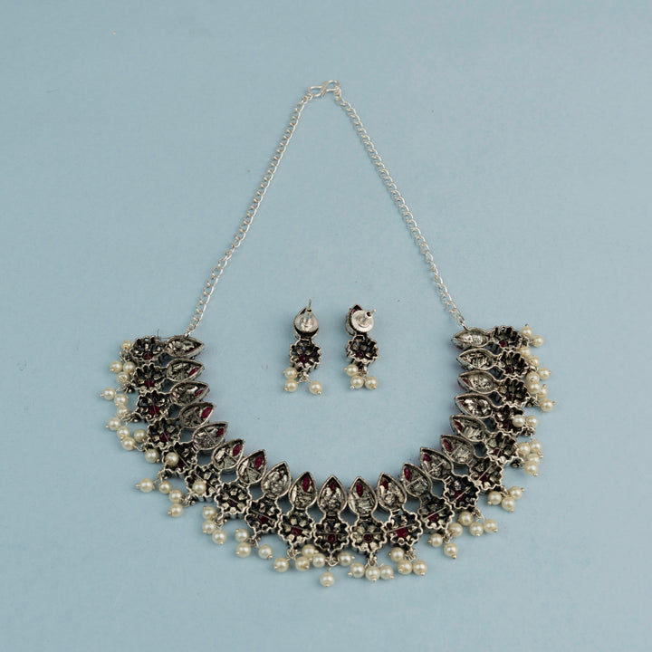 Our red stone studded German silver neckpiece set exudes elegance. Perfect for adding a pop of color and sophistication to your ensemble.